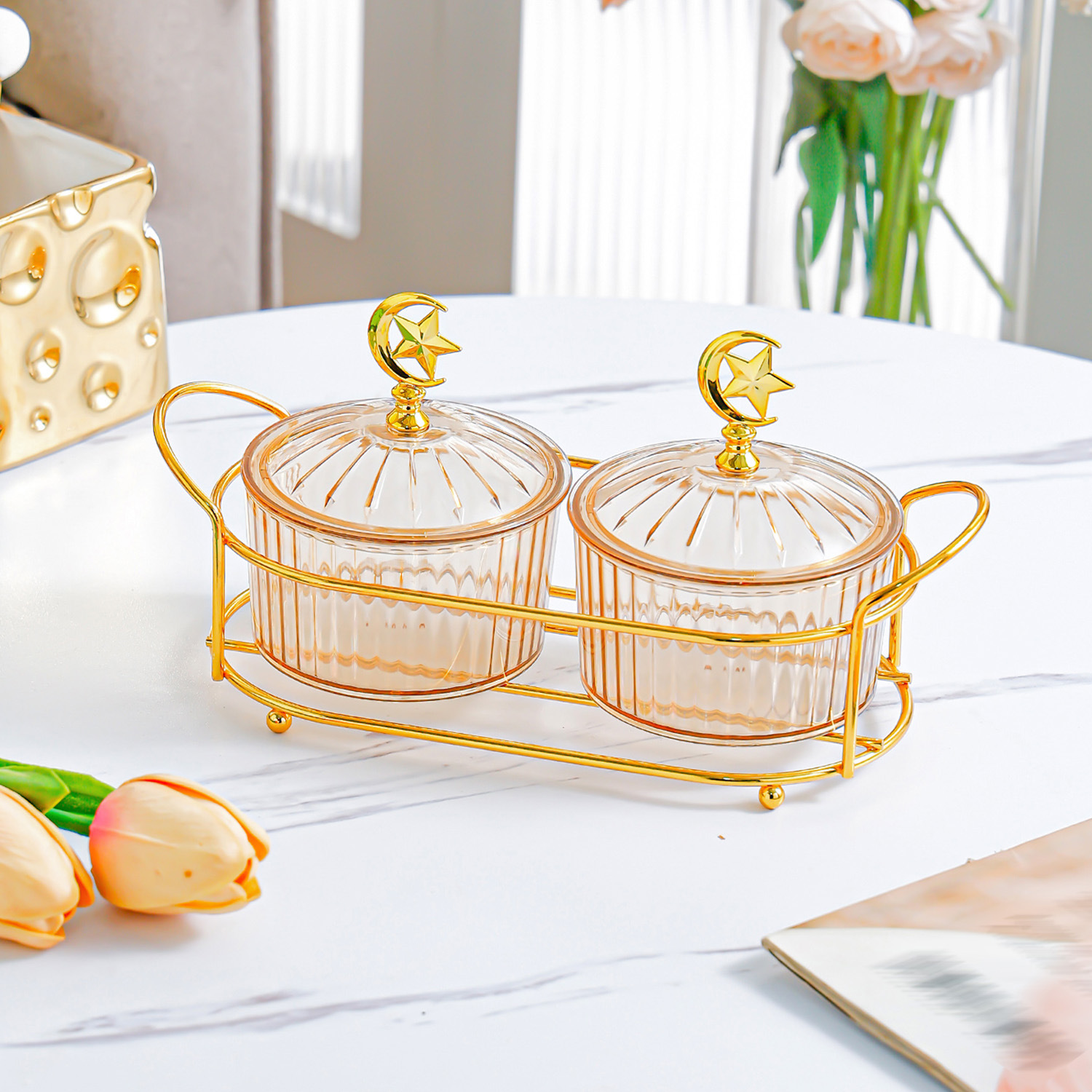 golden round frame 2-compartment amber dried fruit dish, star and moon beads, style b