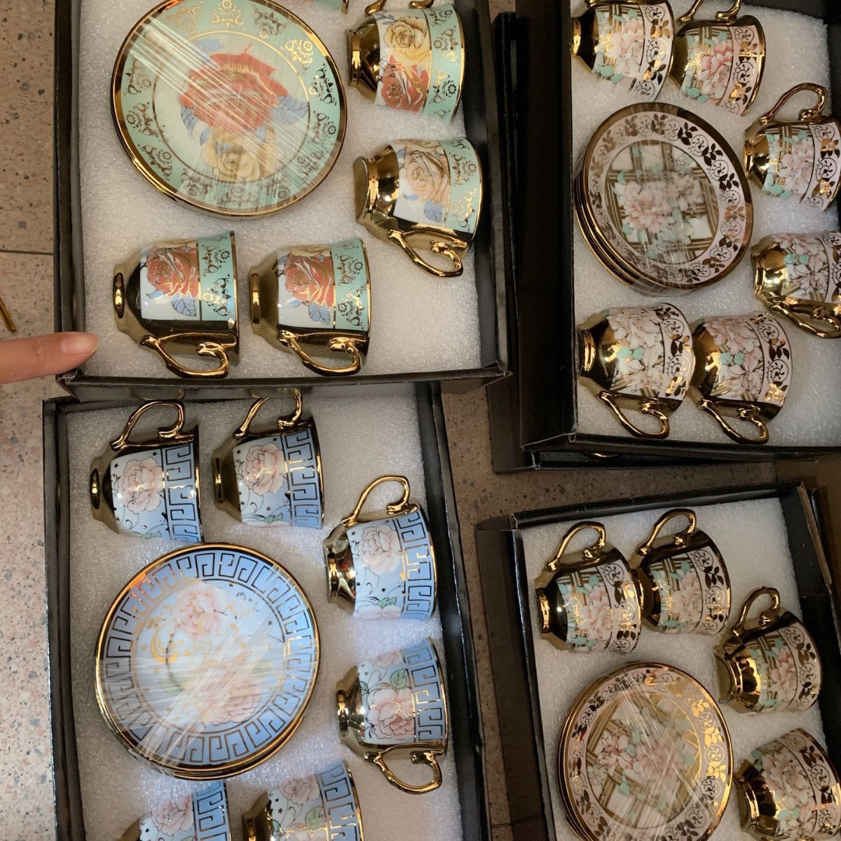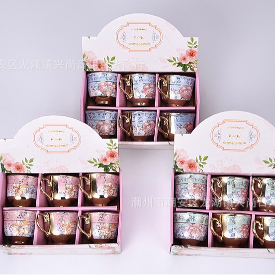 electroplated six-cup, six-saucer sets with assorted patterns {24 sets per carton}