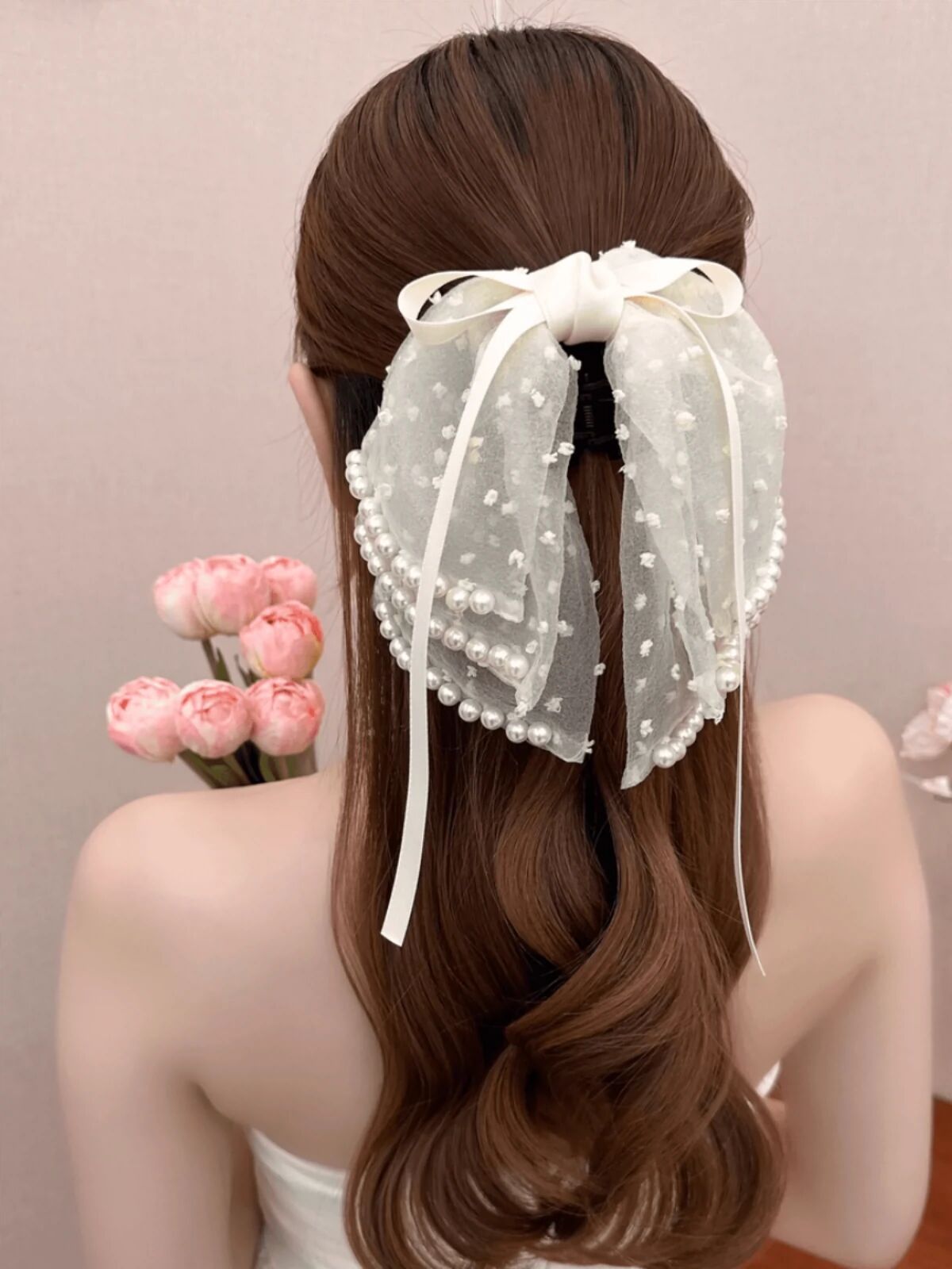 31# white mesh hanging pearl butterfly clip ponytail clip