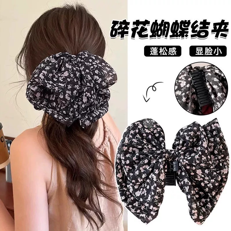 50# black background white floral ponytail clip