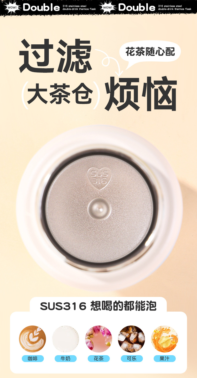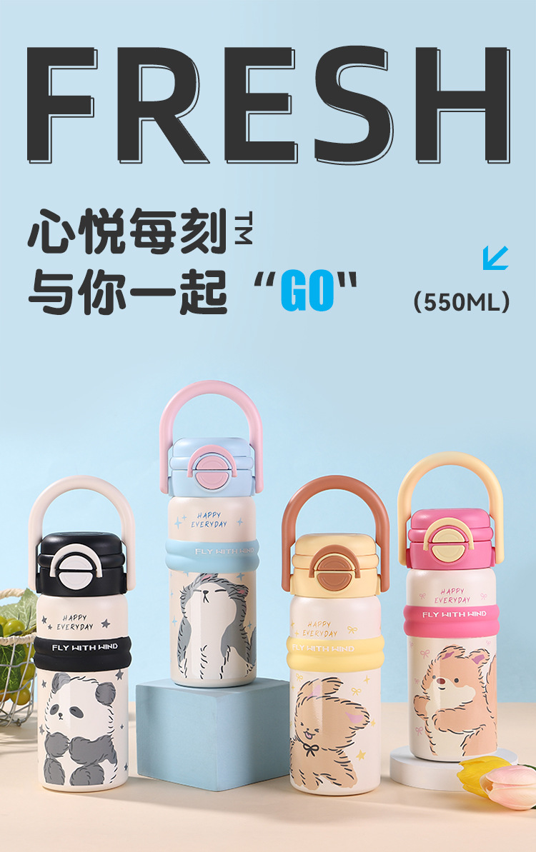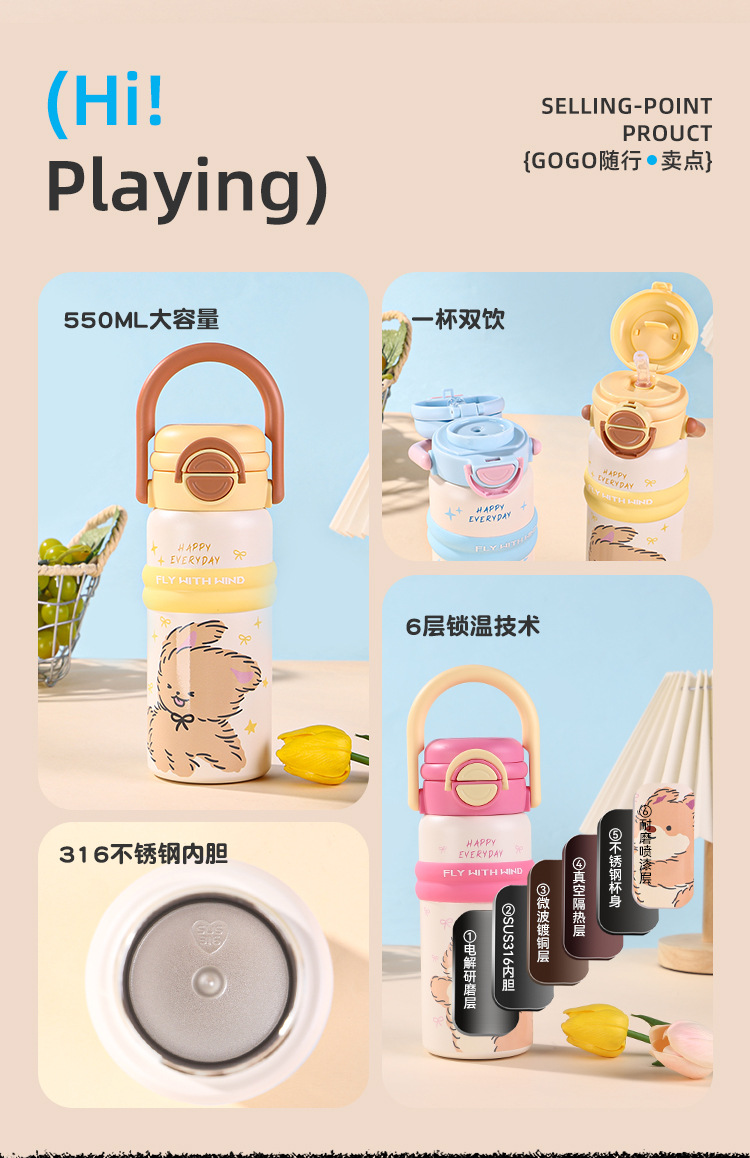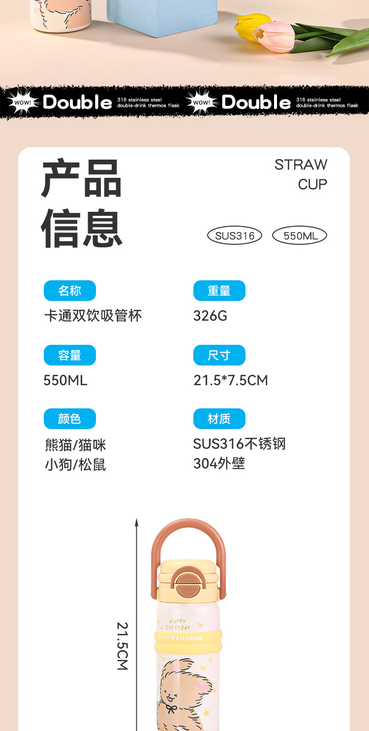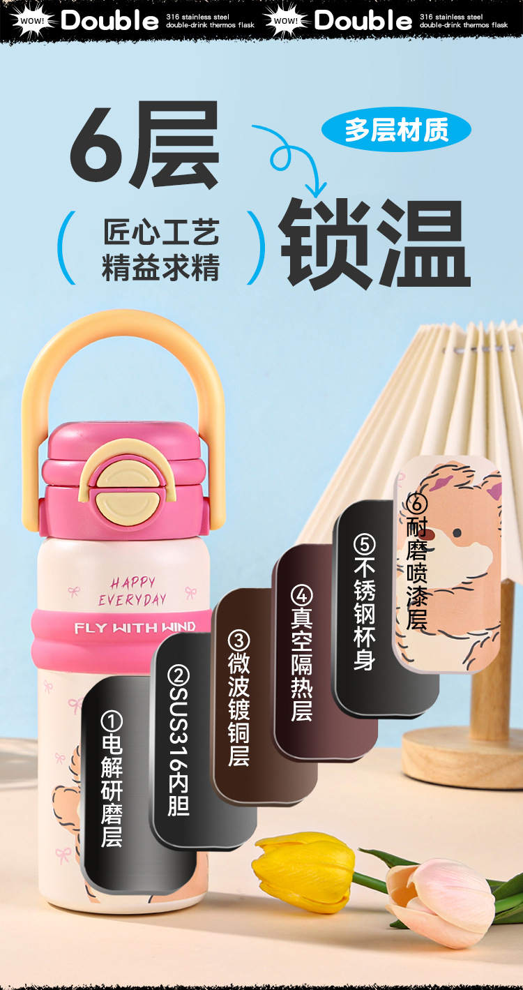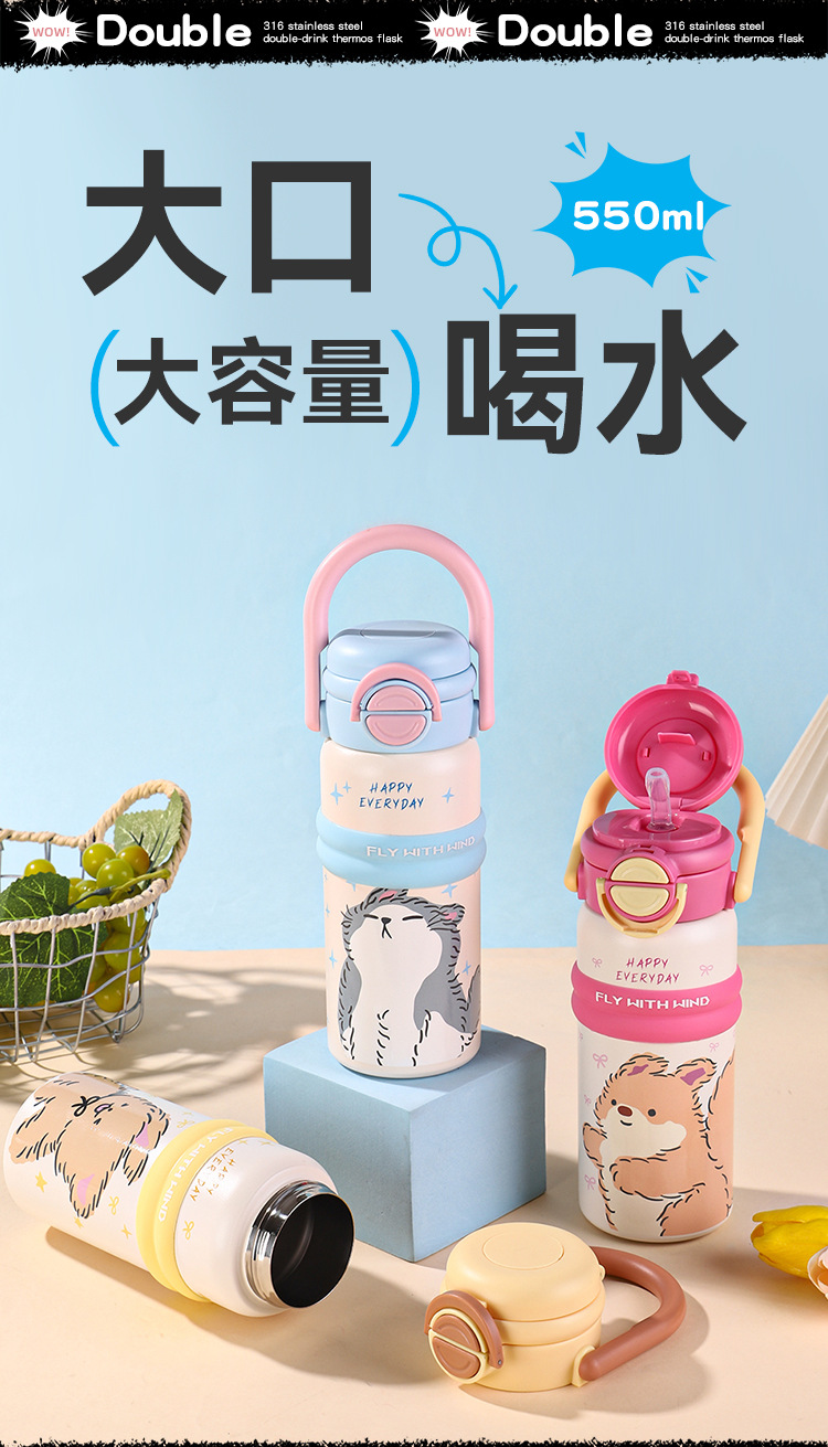 new 316 stainless steel vacuum cup cute fashion portable children's water cup large capacity cartoon double drink cup with straw