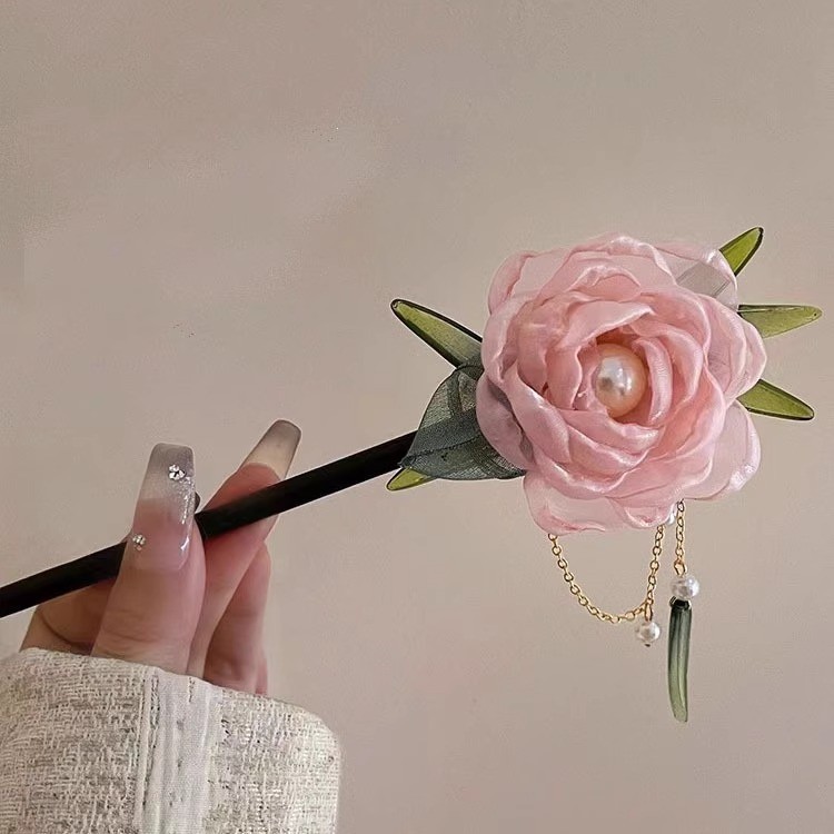 6# ultra-fairy hairpin-pink floral bamboo leaf tassel hairpin