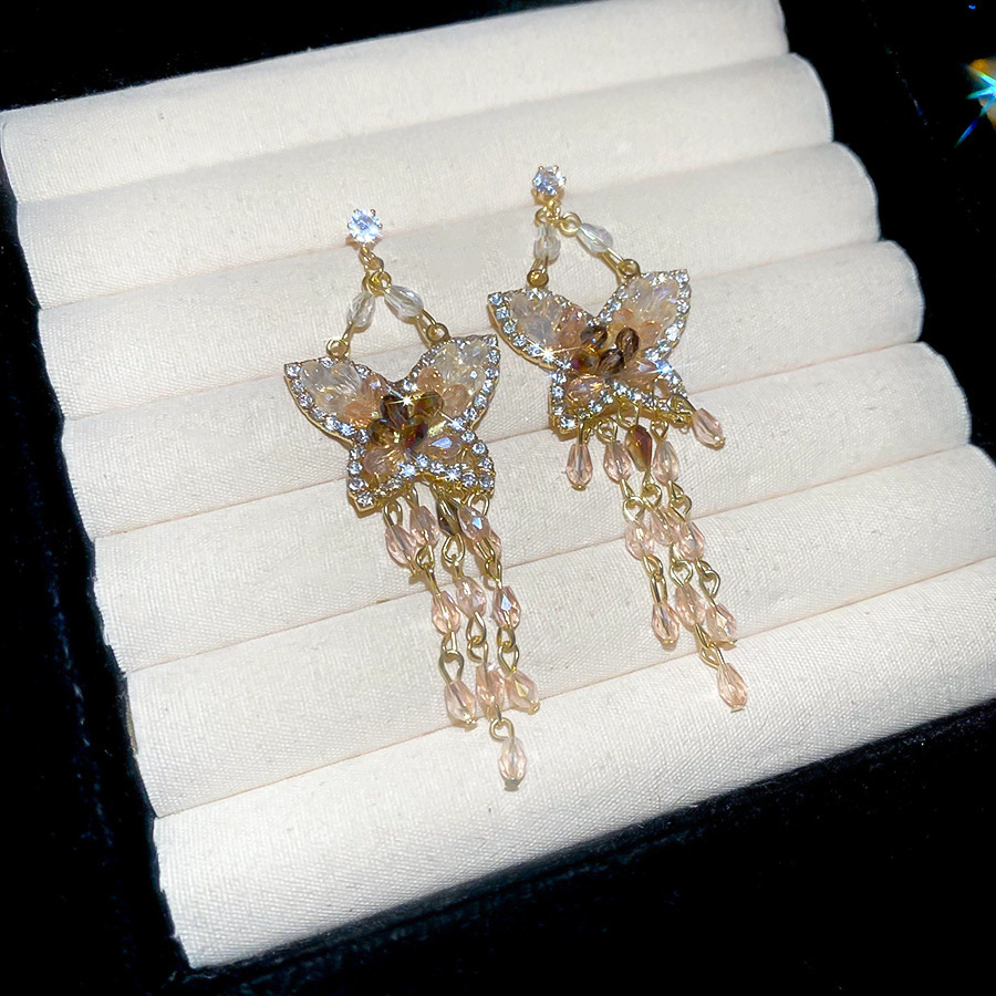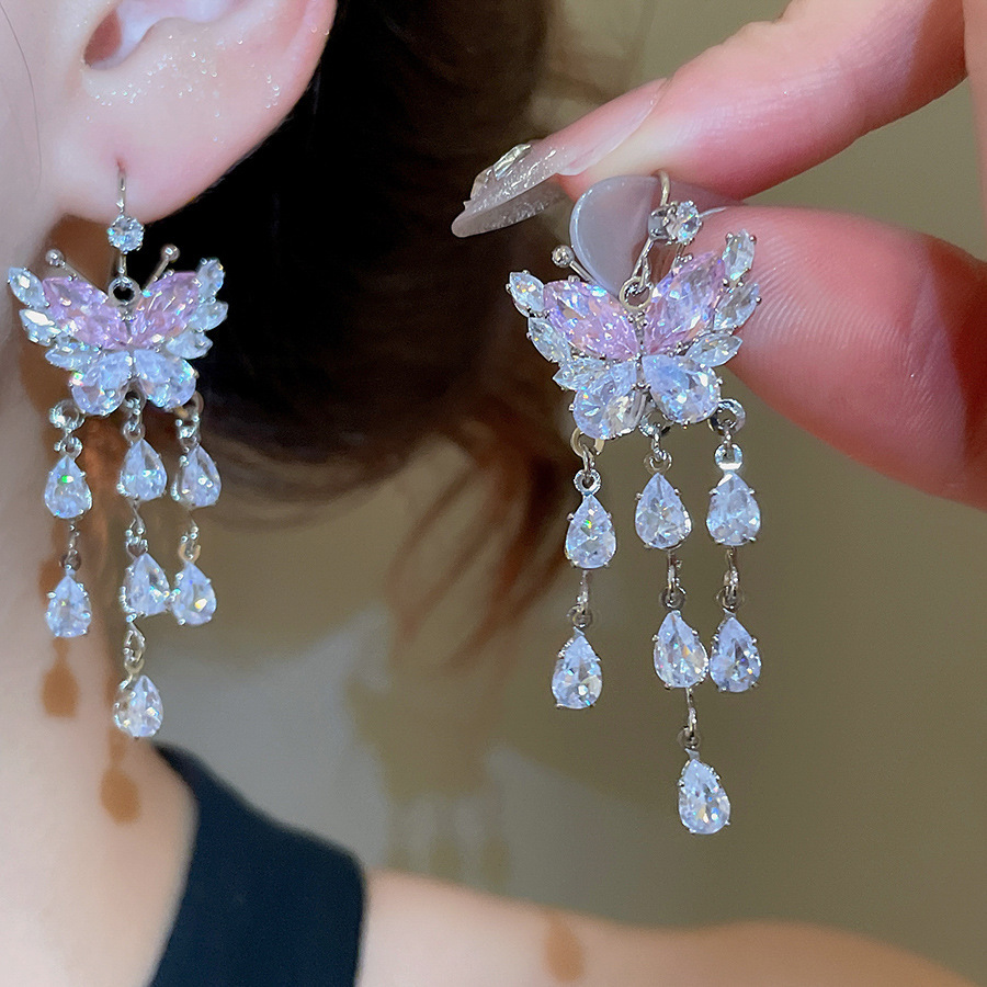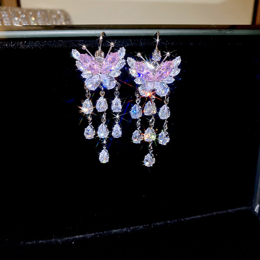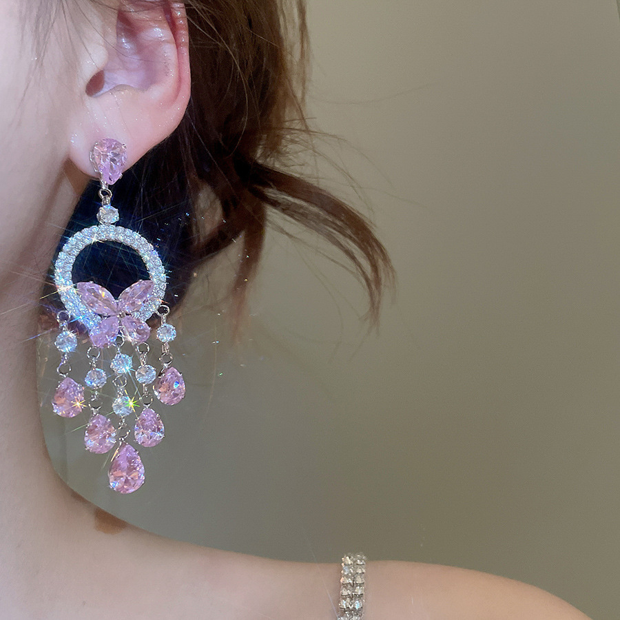 10# ear hook-silver-pink zircon butterfly tassel