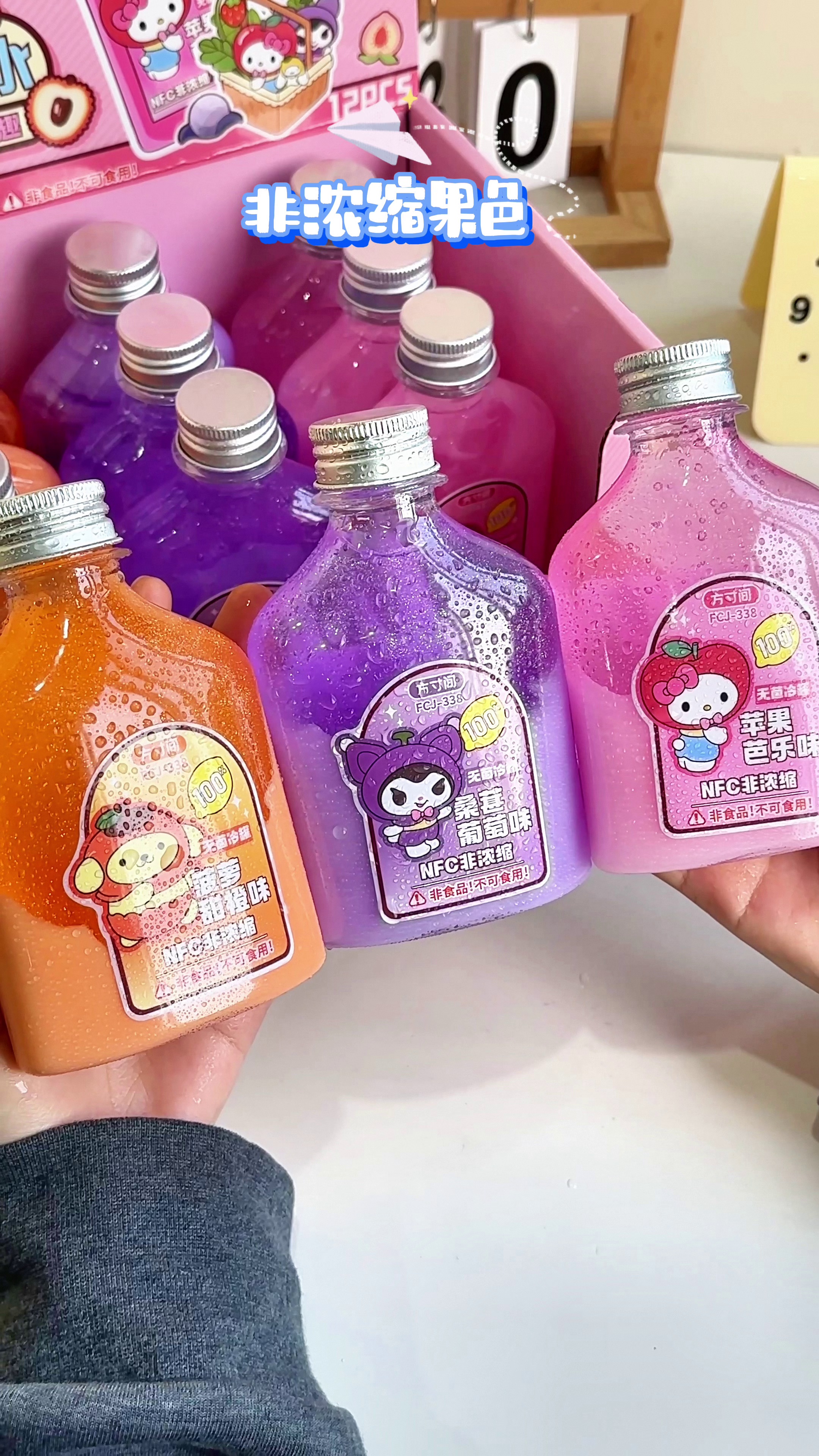 【Cute Juice Bottle】Creative design of a simulated juice bottle with cute cartoon shapes and fruit colors (e.g., papaya pink, orange, grape purple), soft non-sticky fake water, portable and fun, safe and reliable.