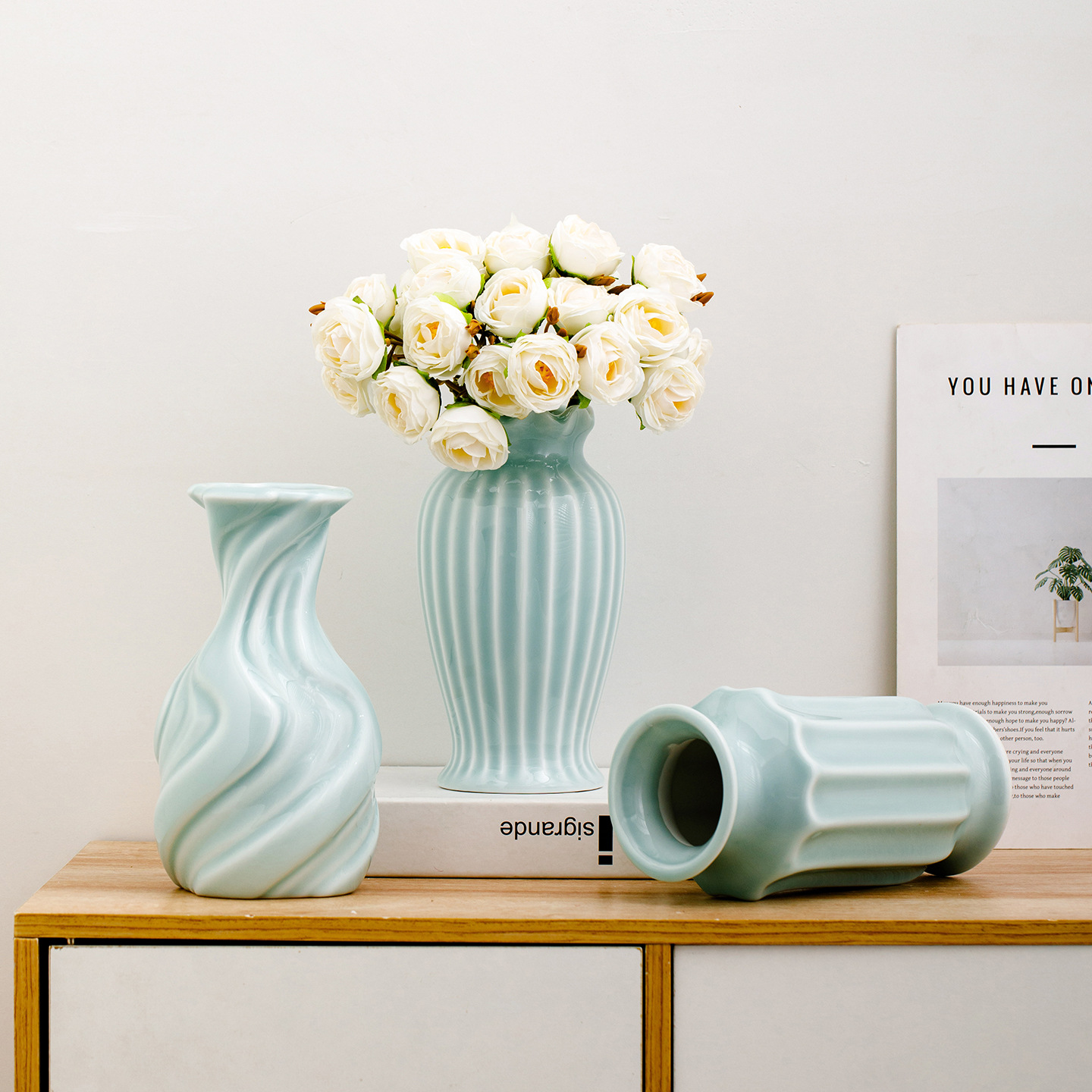 after the snow has stopped. medium size (powder blue) +2 champagne-colored peonies in bloom.