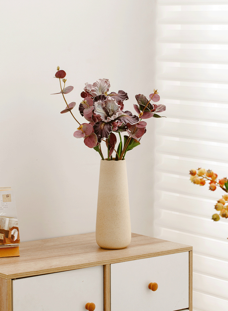 toyouth. large model (beige dots) + iris tectorum and butterfly orchid bouquet (deep purple)