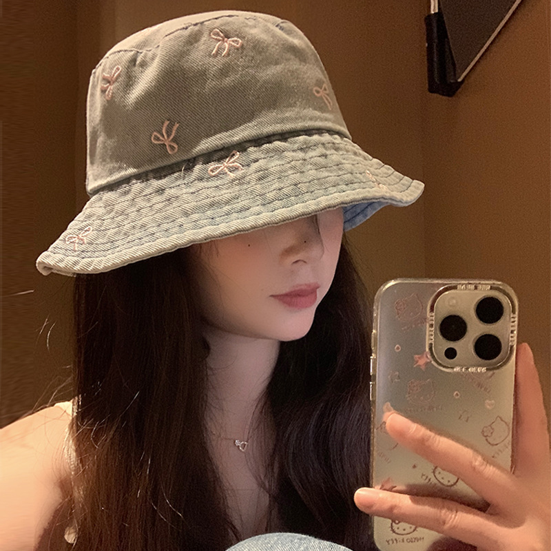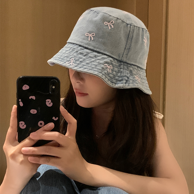 japanese style washed distressed bowknot jean fisherman hat women's summer big head circumference show face small bucket cap sunshade sun protection hat