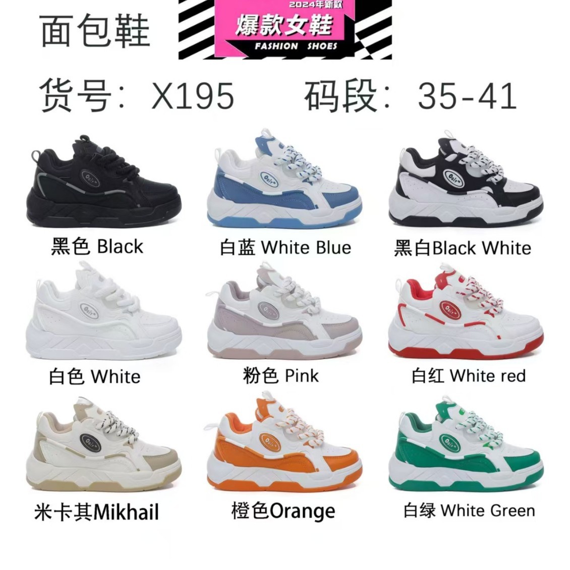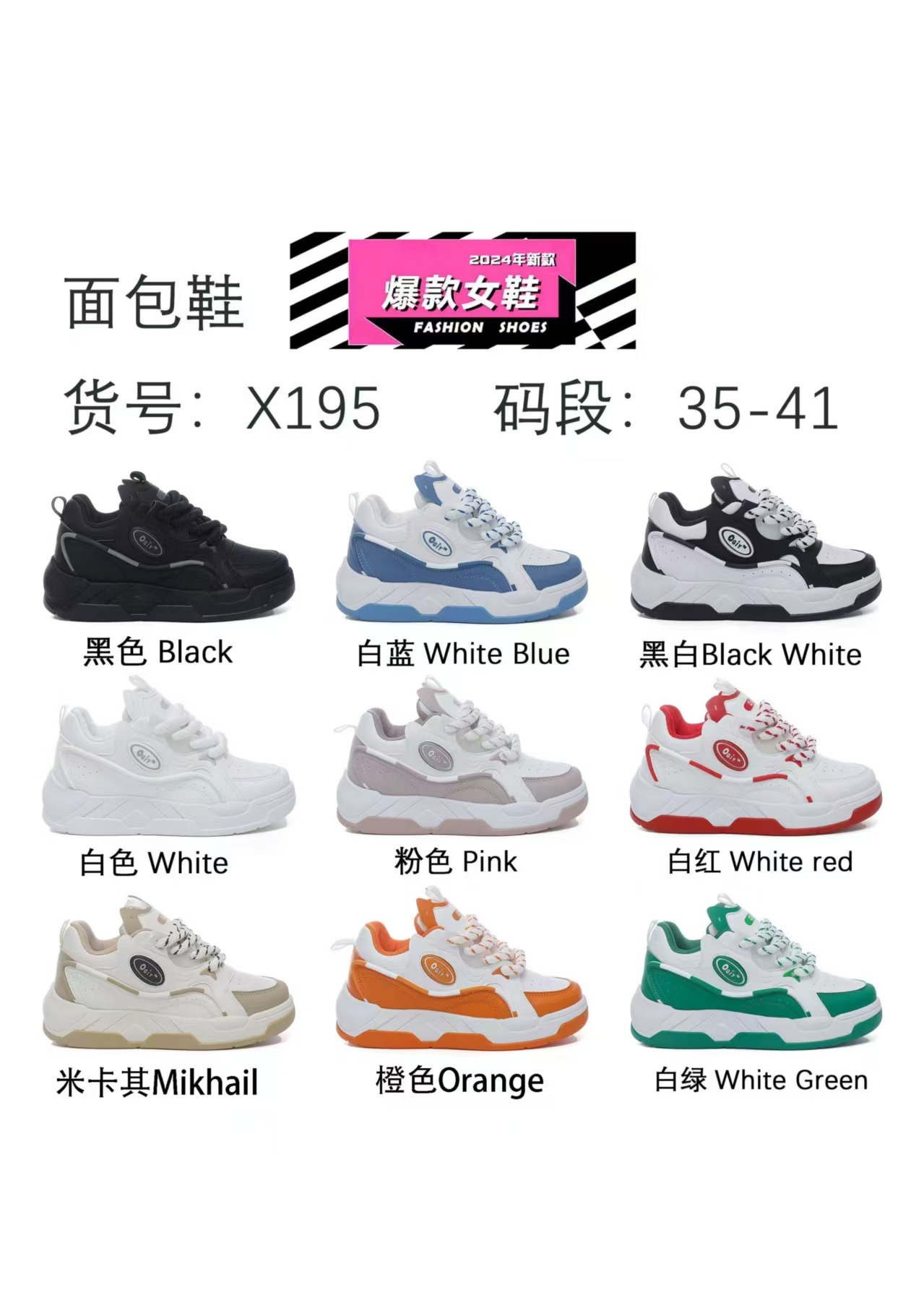 color: black, white and blue, black and white, white, pink, white and red, beige khaki