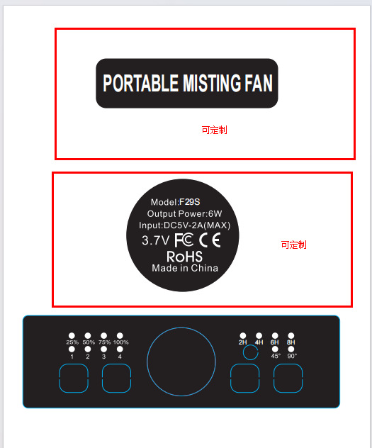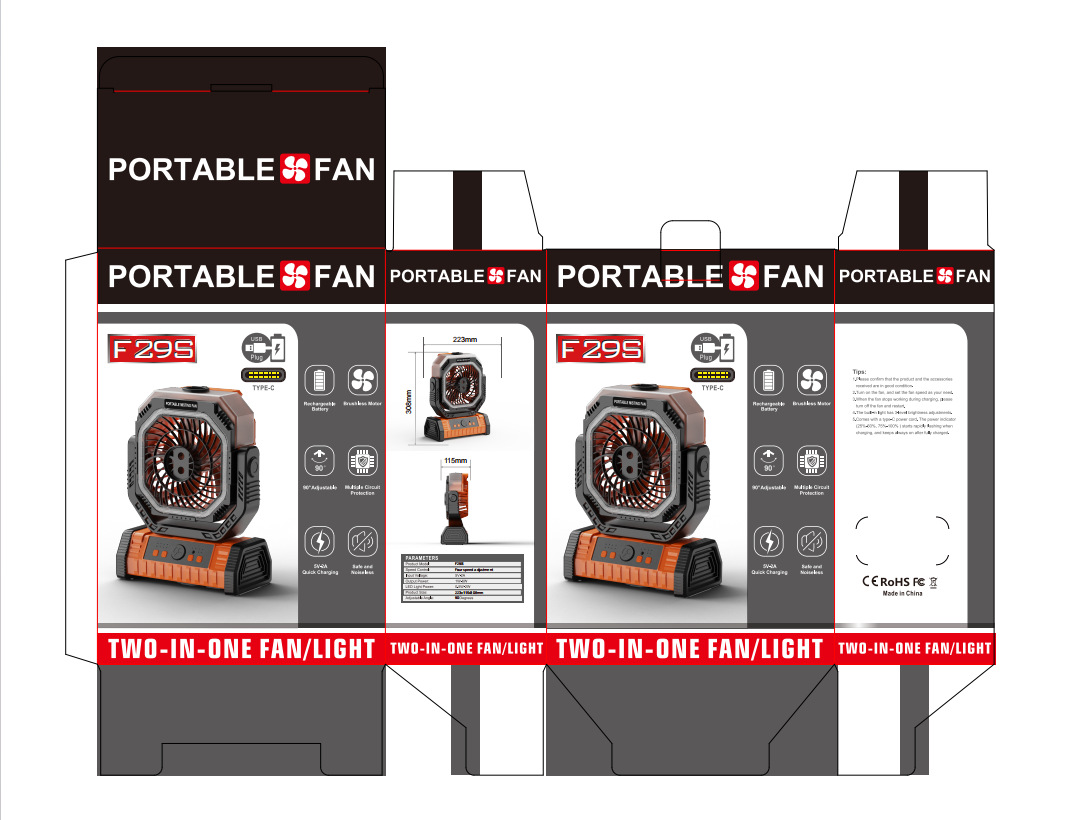 The fan can hold up to 12 units per case. The fans are available in two specifications: 10000mAh and 20000mAh. Other specifications require custom ordering. The color box dimensions are 22.7x11.9x31.5cm, and the outer box dimensions for 12 units are 47.5x37.5x65cm. The battery is the 1260110 model, which supports printing. It has UN38.3 and MSDS certification, and a complete machine transportation report is available. Free labeling services are available.