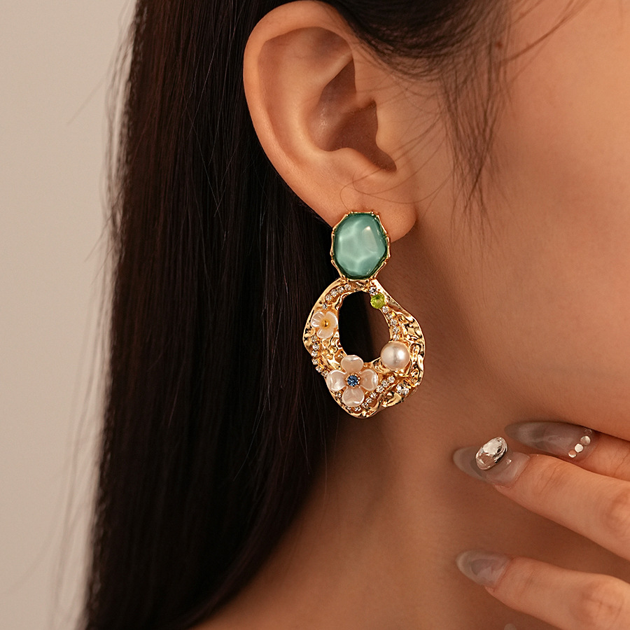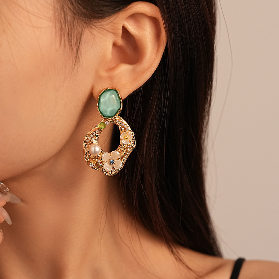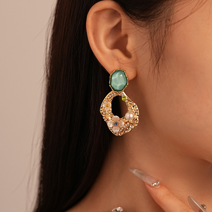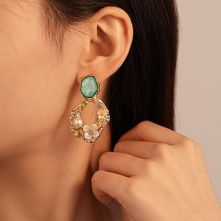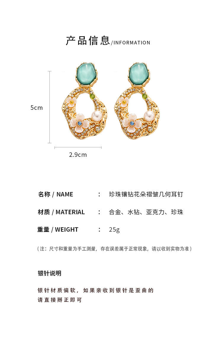 silver needle-green flower geometric ear studs