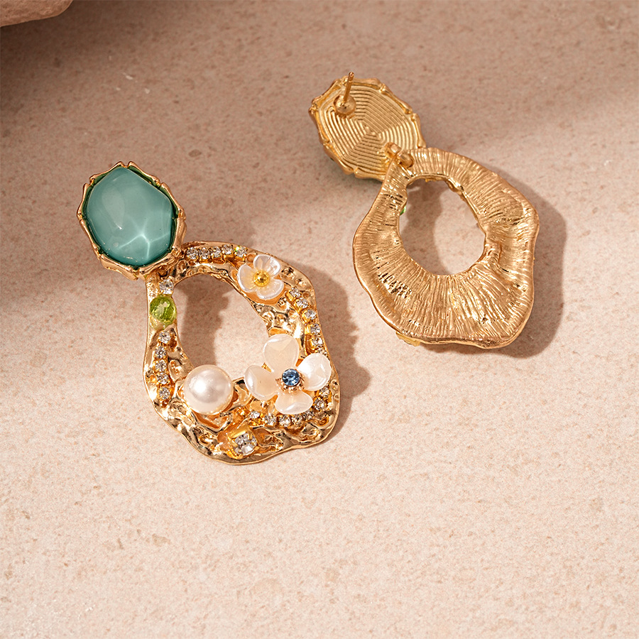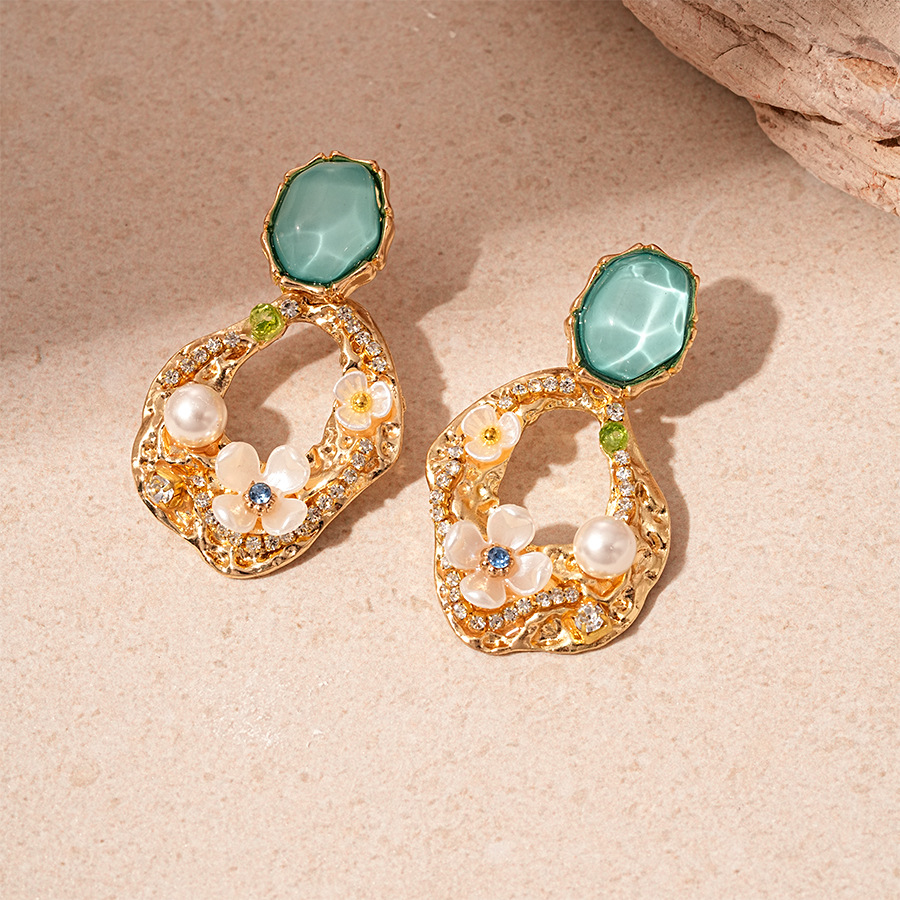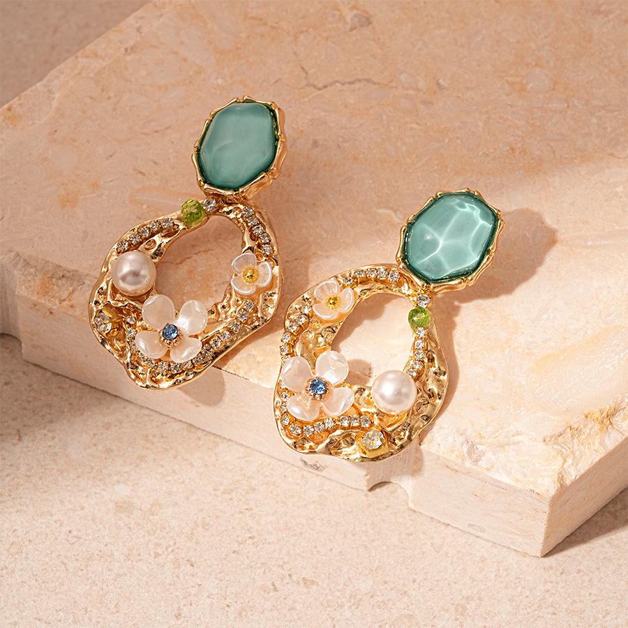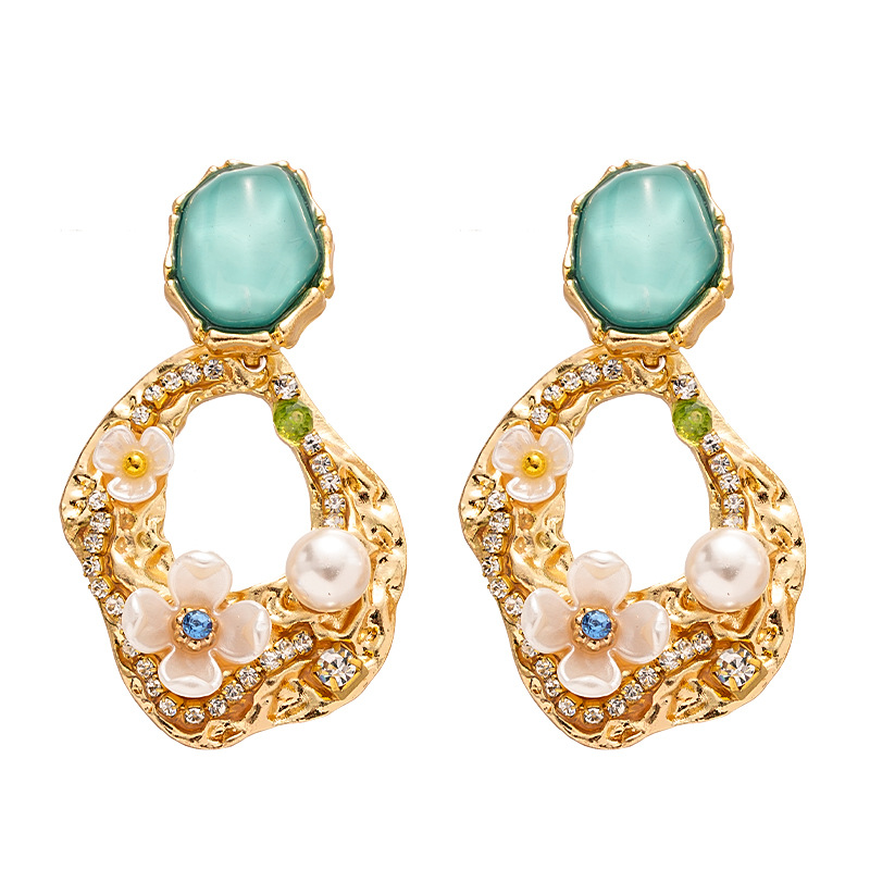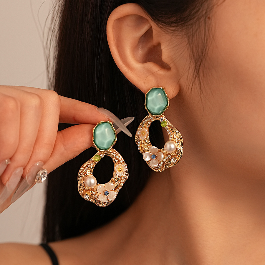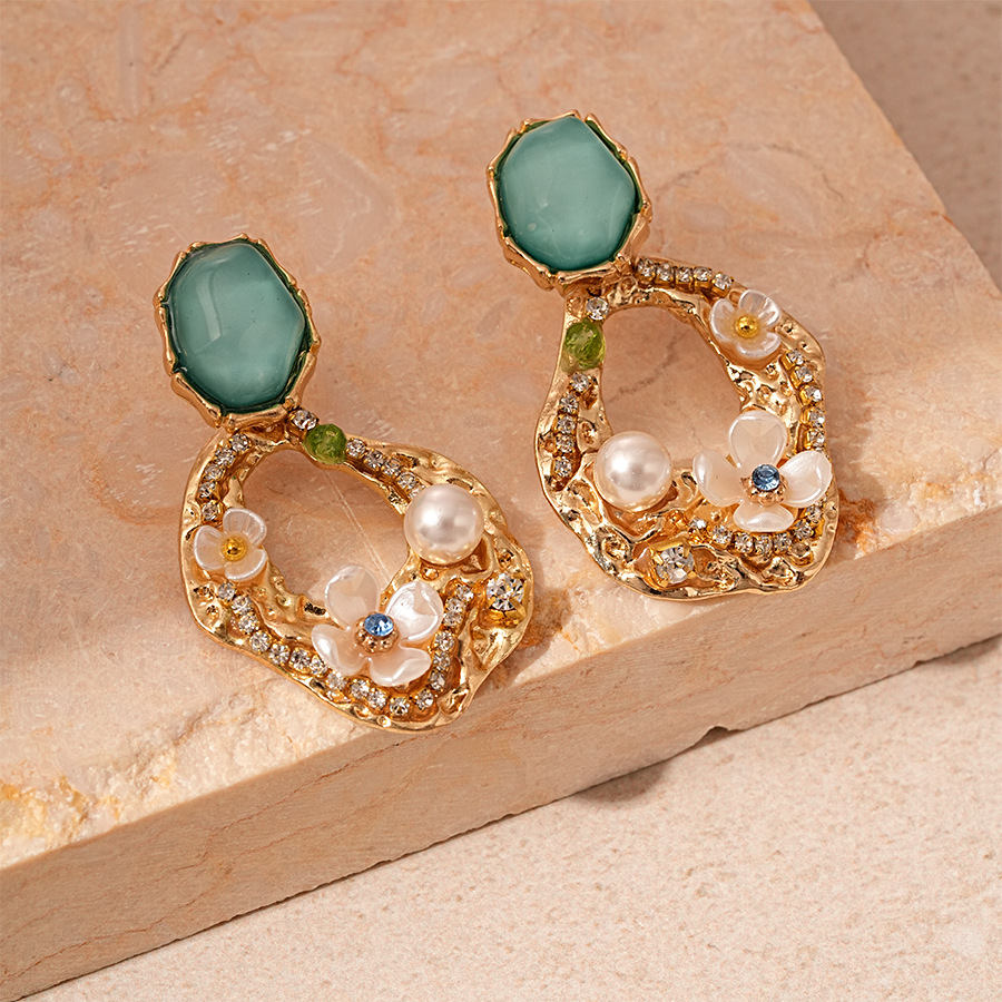 silver needle-green flower geometric ear studs