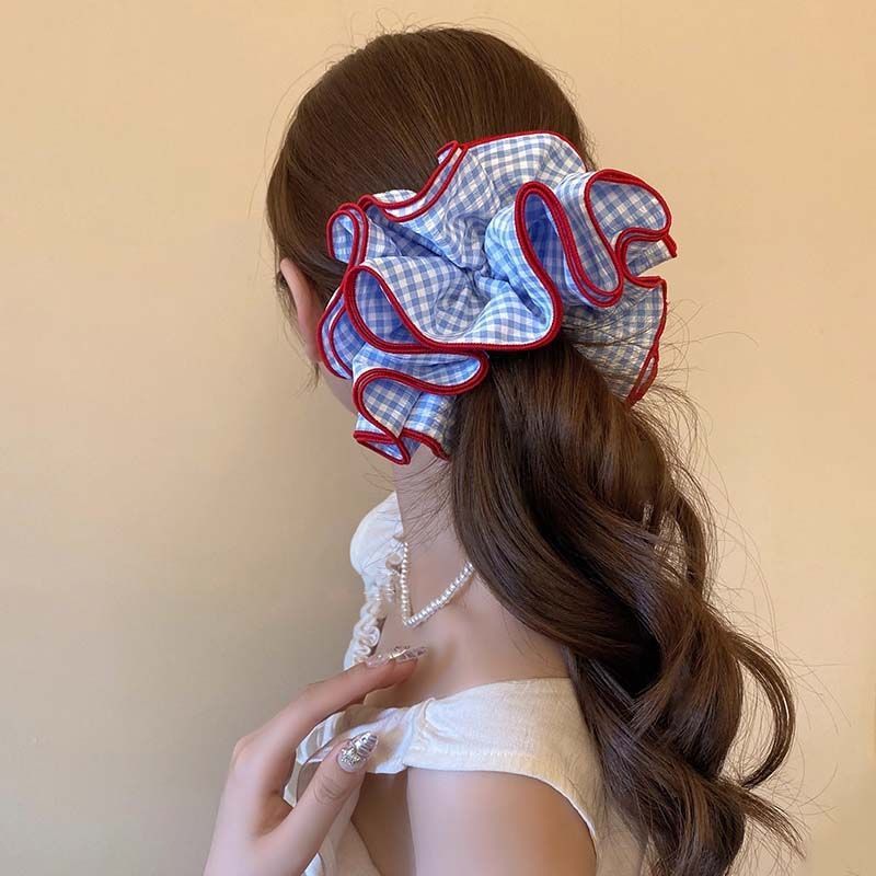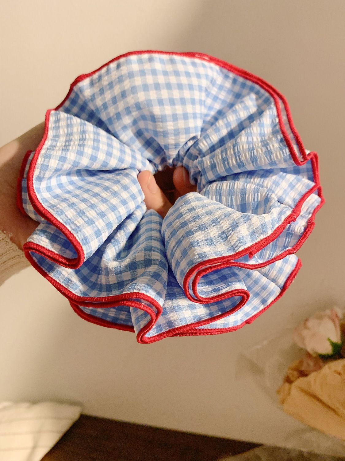 red-stitched blue and white small plaid four-layer hair tie, approximately 16 cm.