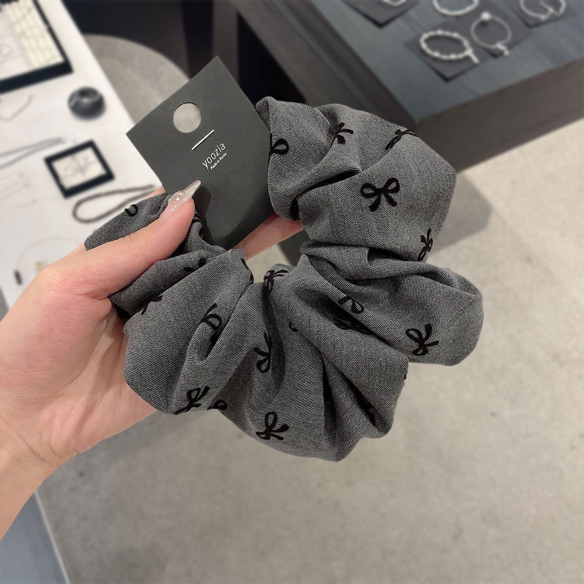 black and gray bow-printed large hair tie, approximately 14cm in diameter.
