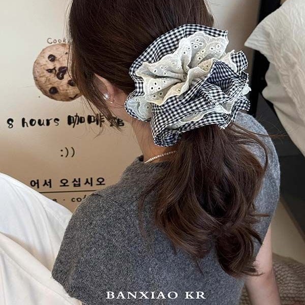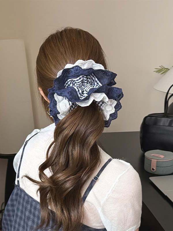 navy blue plaid heart-shaped lace spliced approximately 15cm hair tie