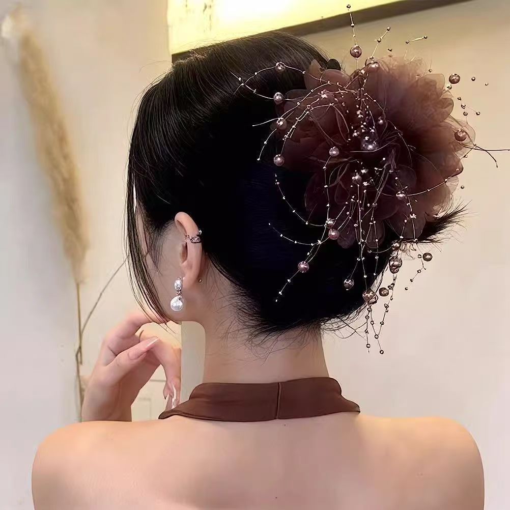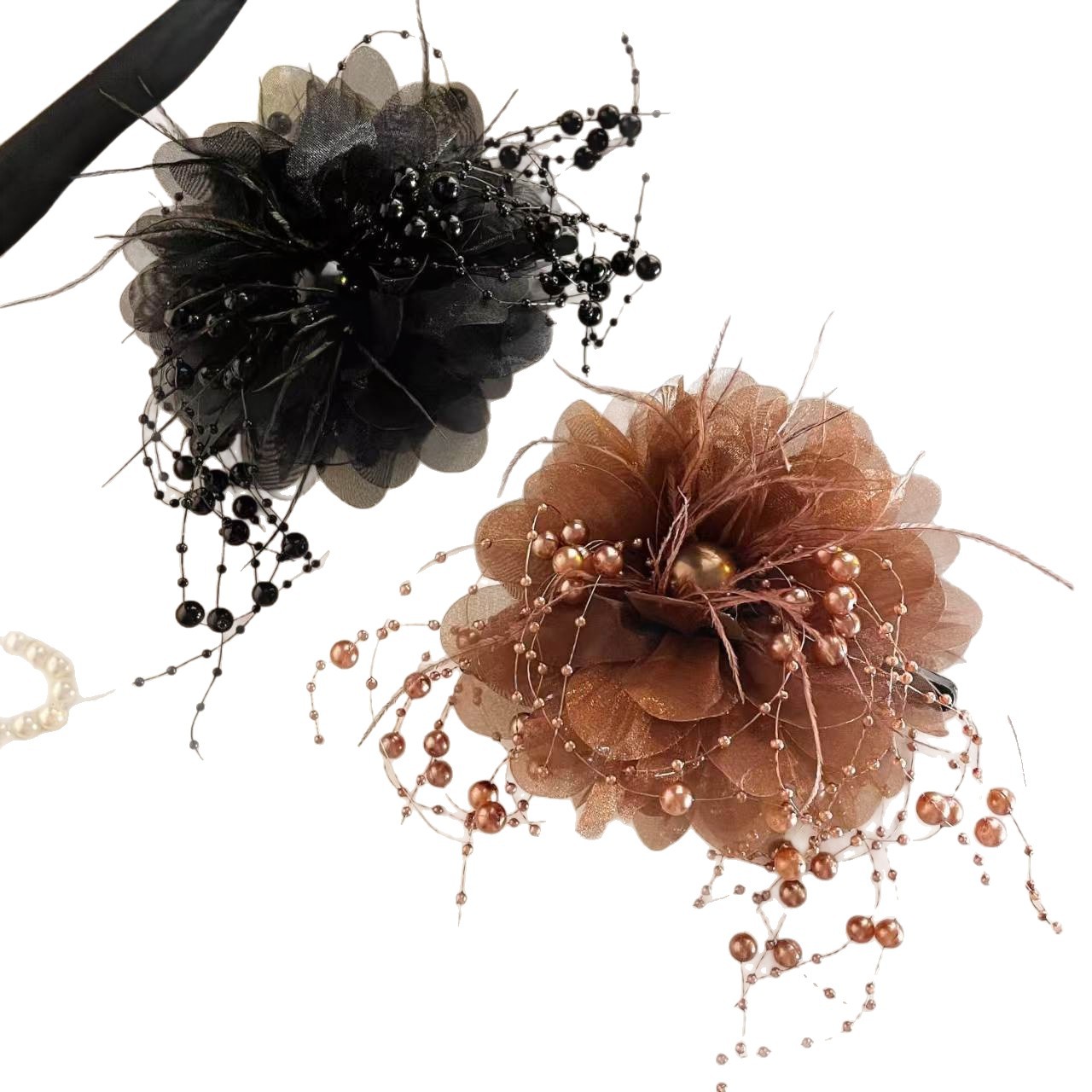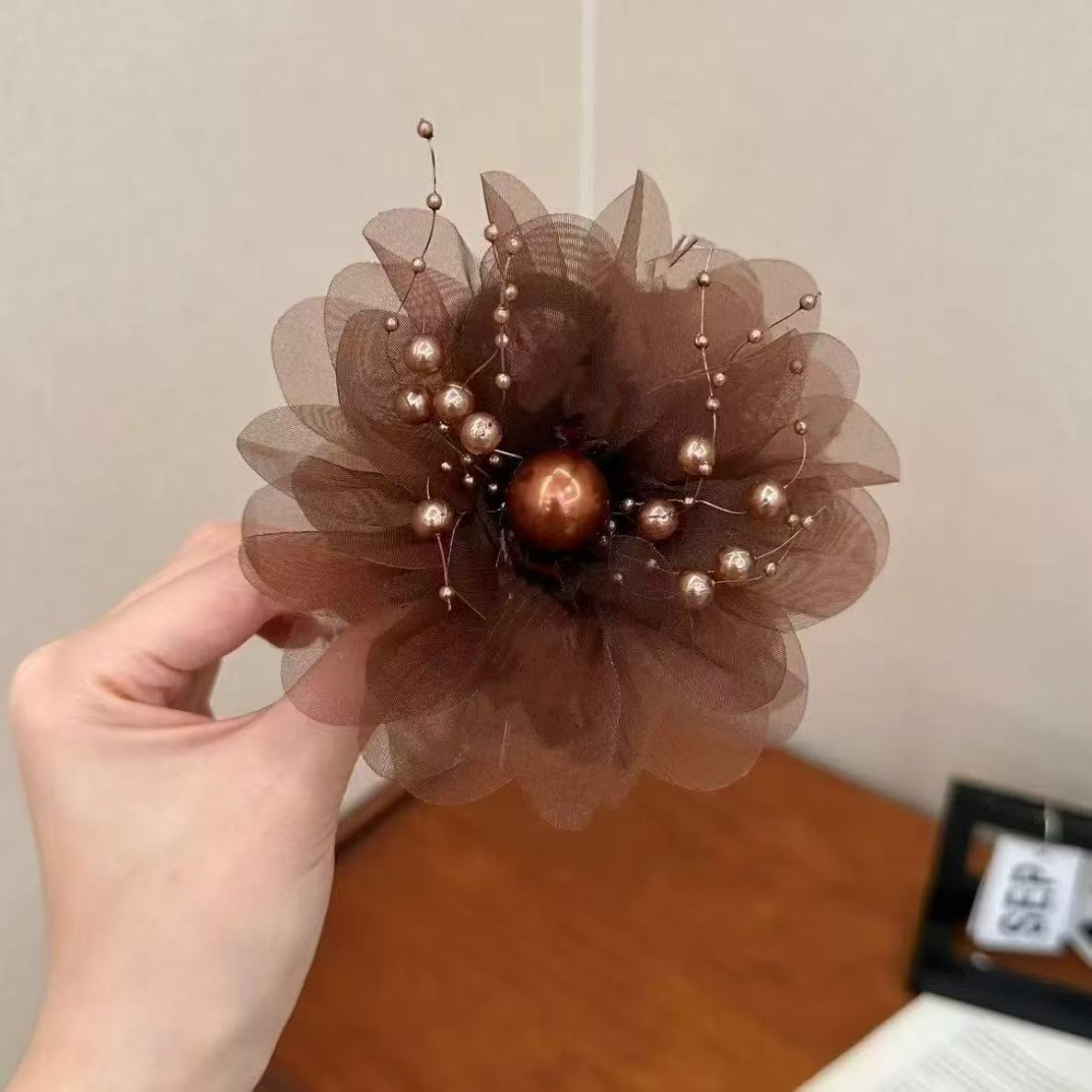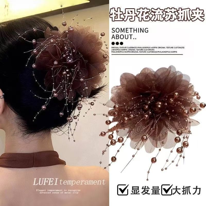 feather tassel beaded peony flower-coffee color 13cm
