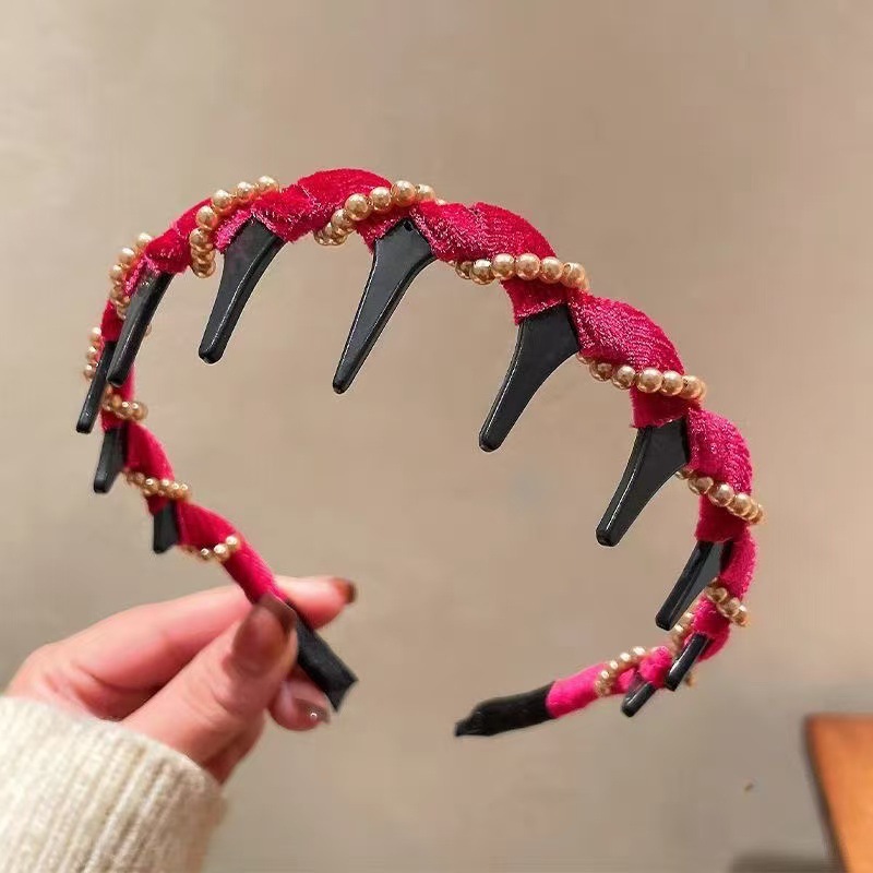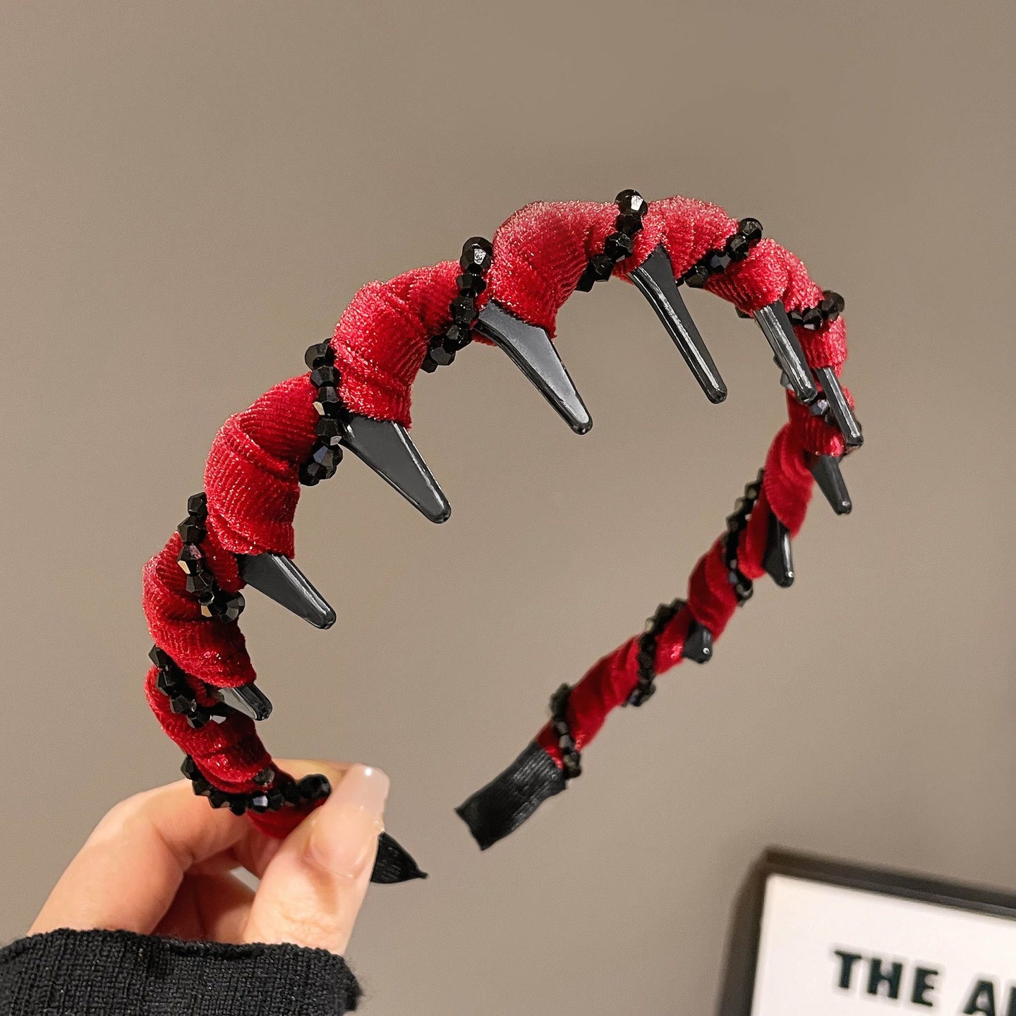velvet black beaded headband, red