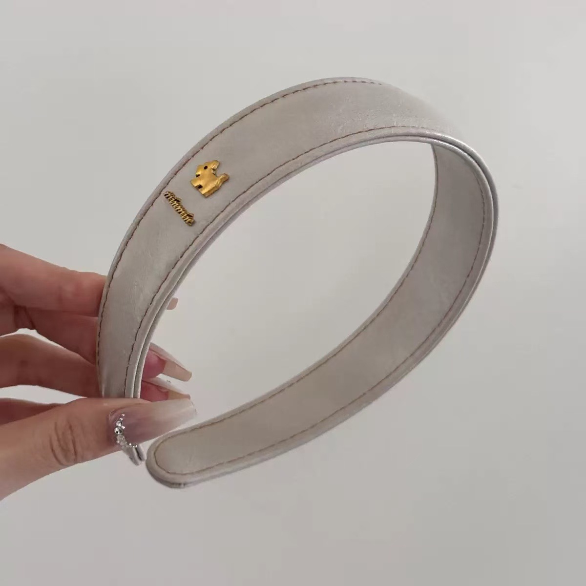 beige double-layered leather headband with piped edges