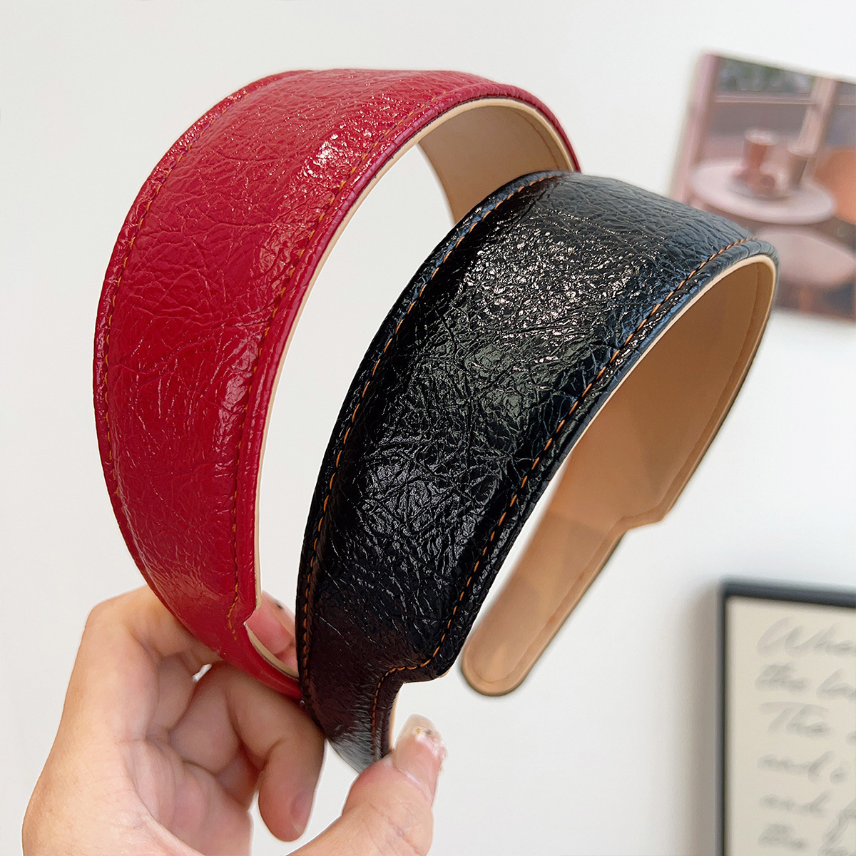 black double layers pressed edge leather hairband