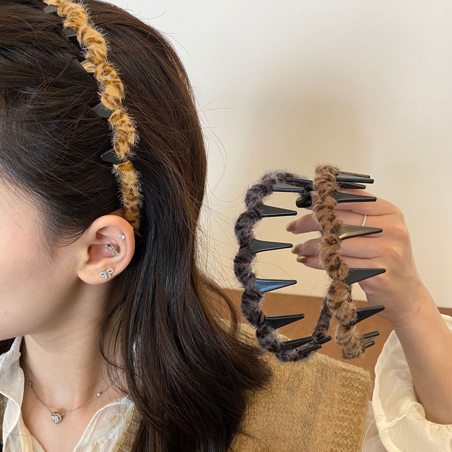 main image: light-colored leopard-print headband