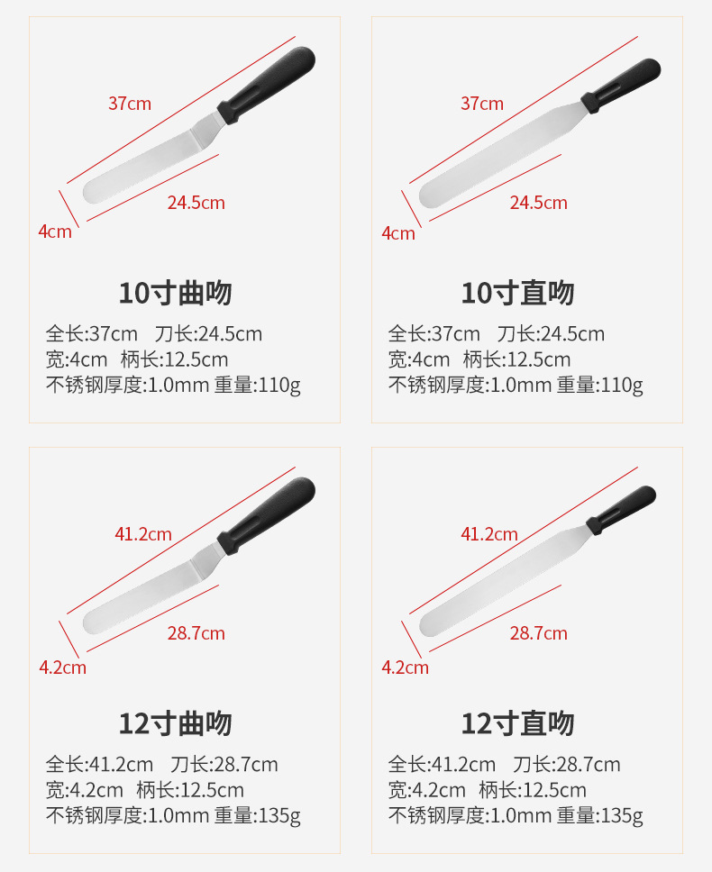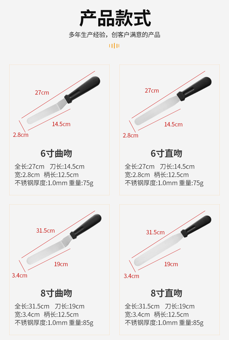 specifications: 6-inch kiss, 6-inch straight kiss, 8-inch kiss, 8-inch straight kiss,