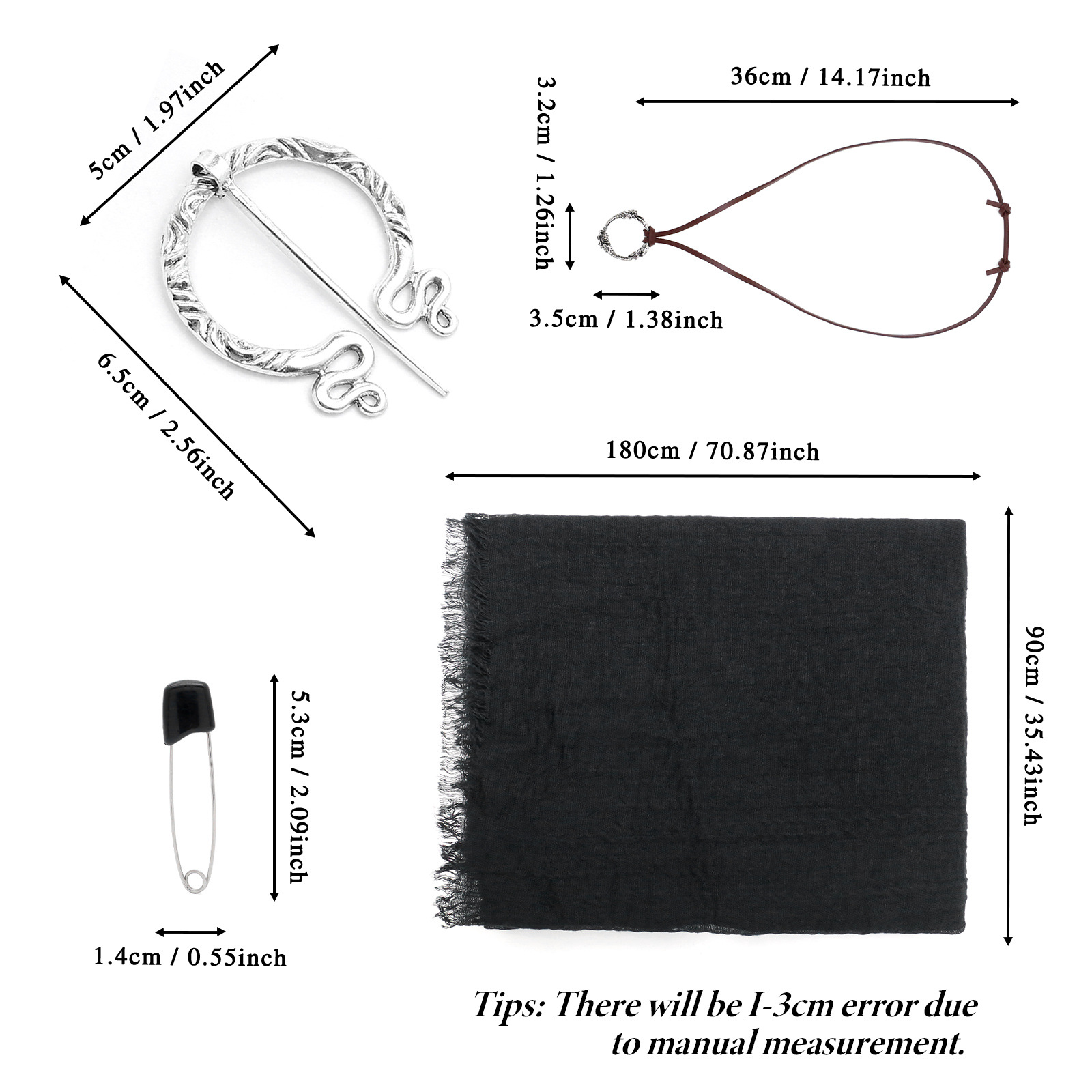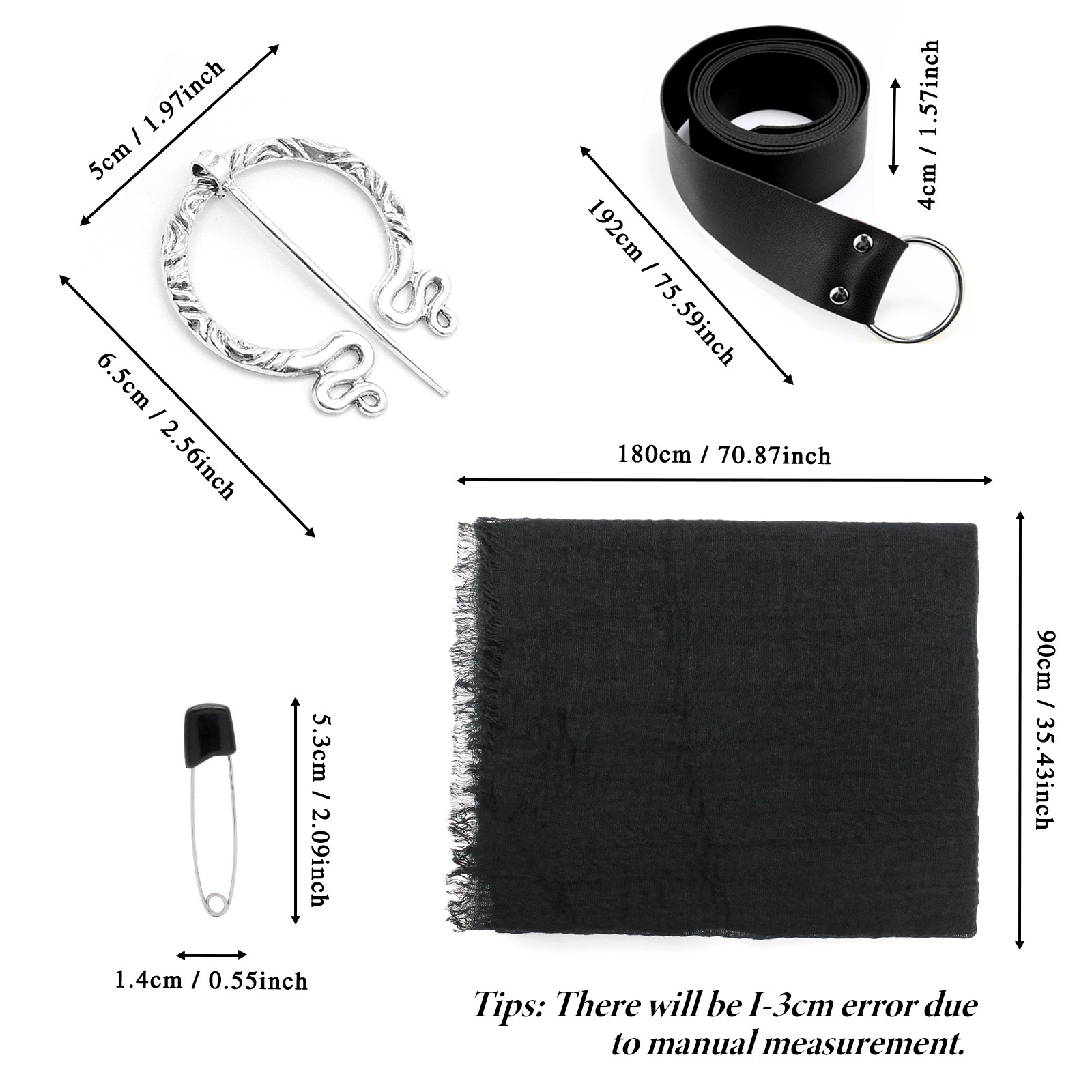 cst155bk (black scarf 180*90cm + brooch + one pair of black pins + 190cm black belt)