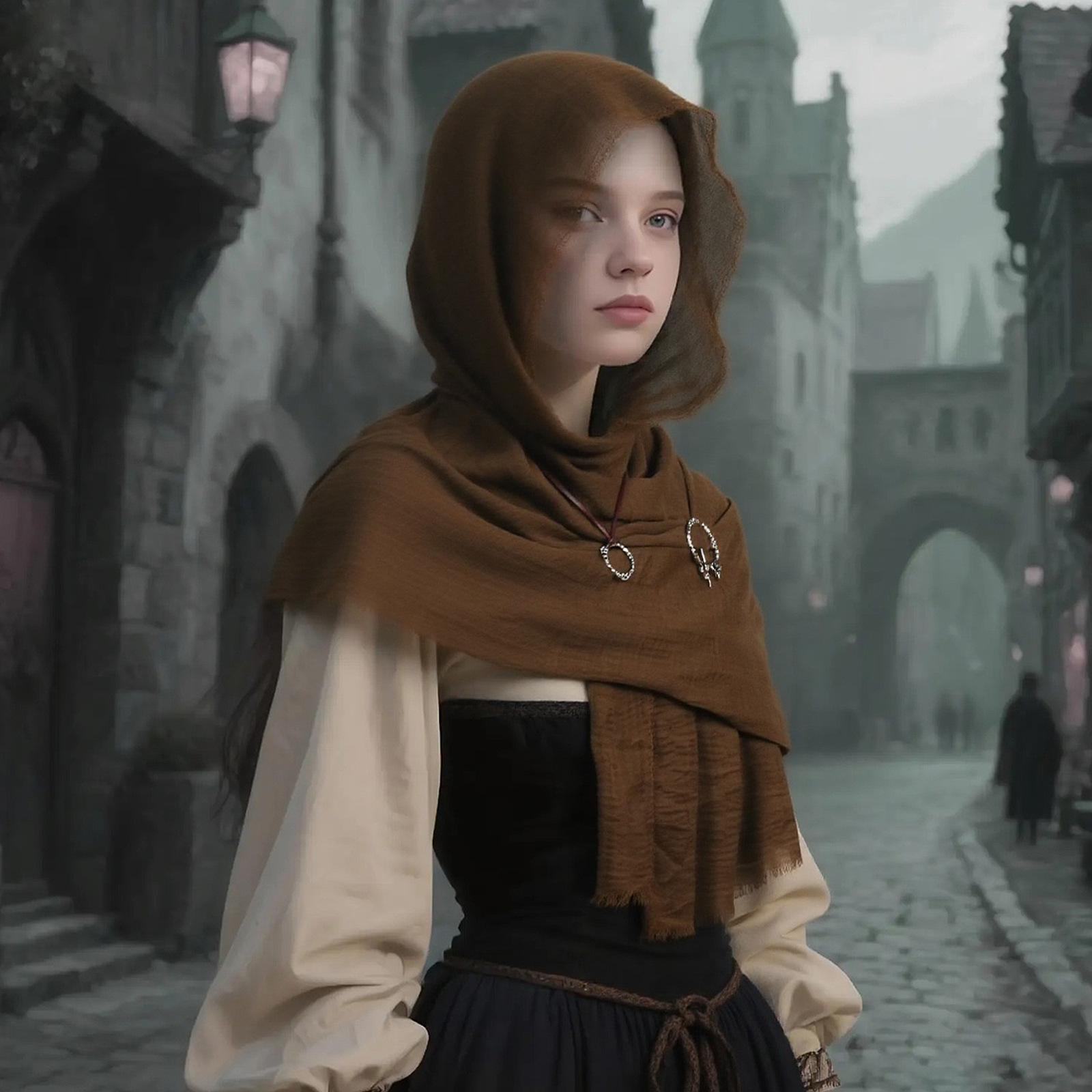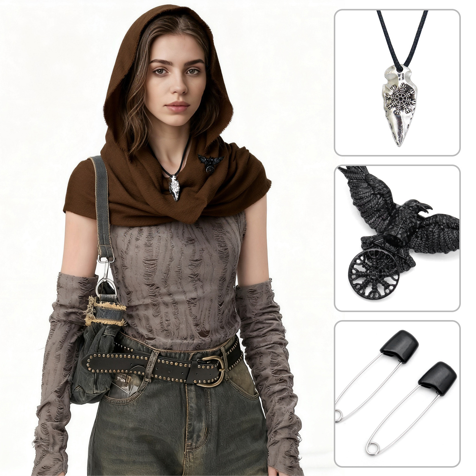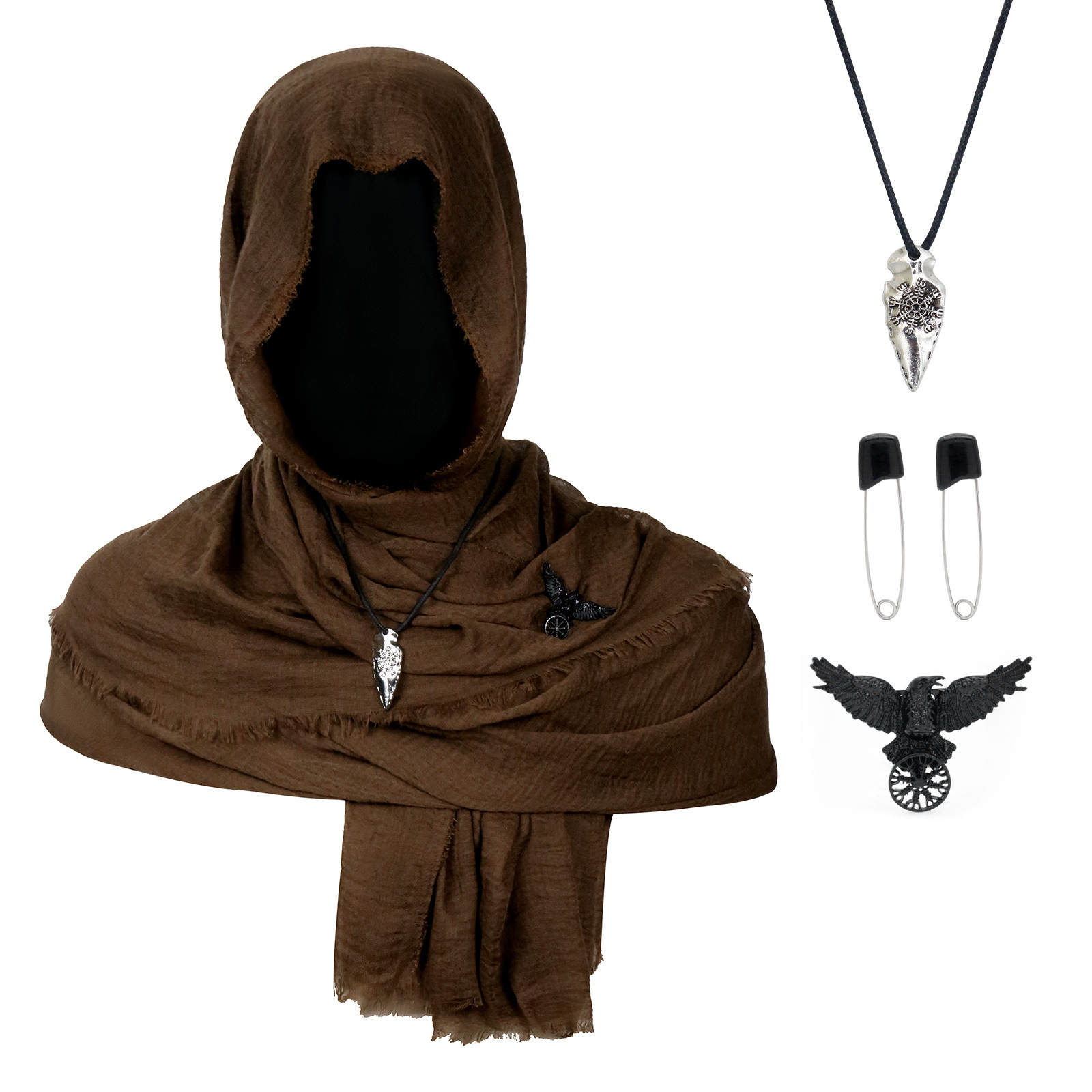 cst154br (brown scarf 180*90cm + black pin 1 pair + black raven scarf buckle + snowflake pendant)