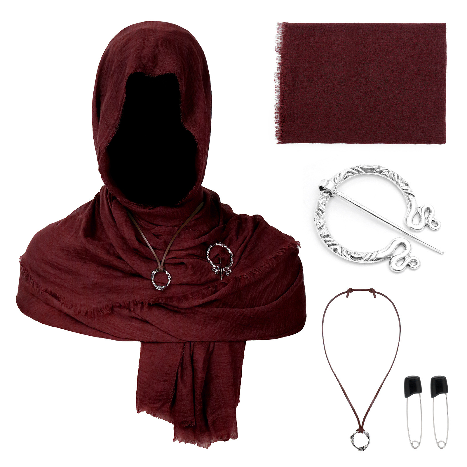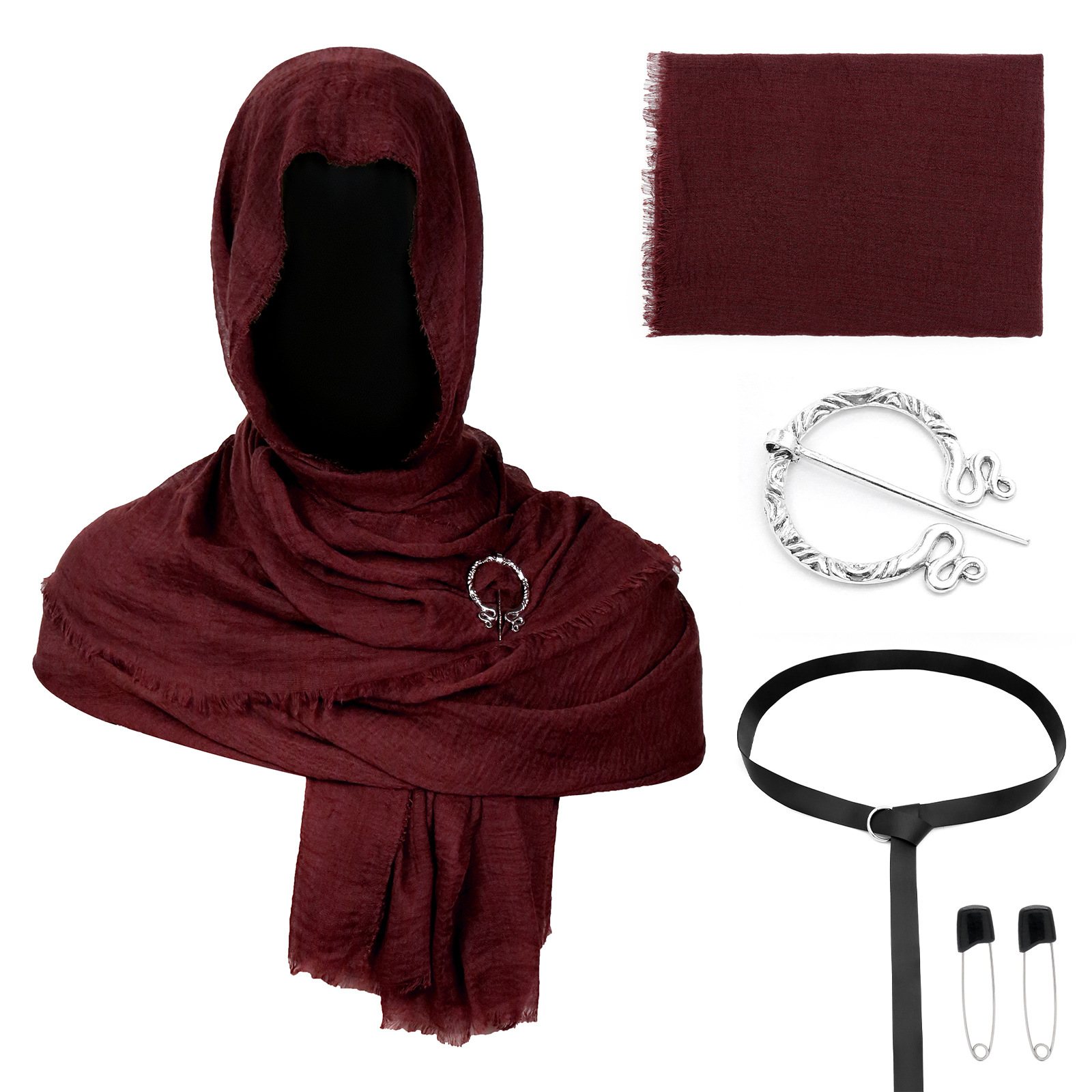 cst154wn (burgundy scarf 180*90cm + black pin 1 pair + black raven scarf buckle + snowflake pendant)