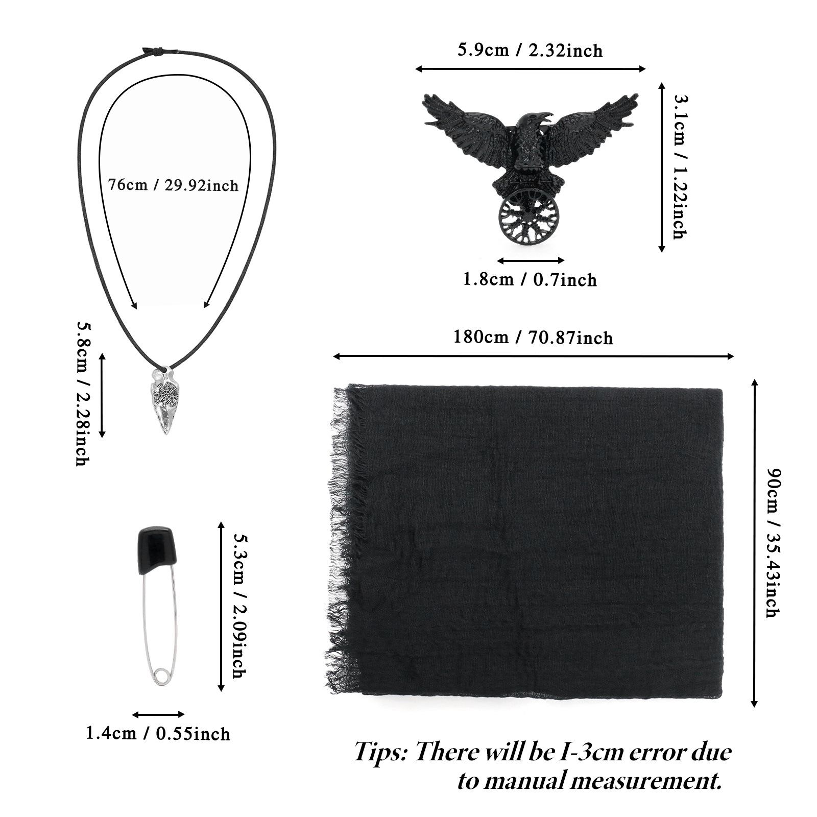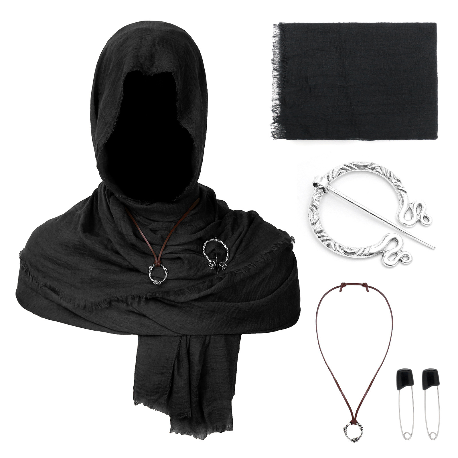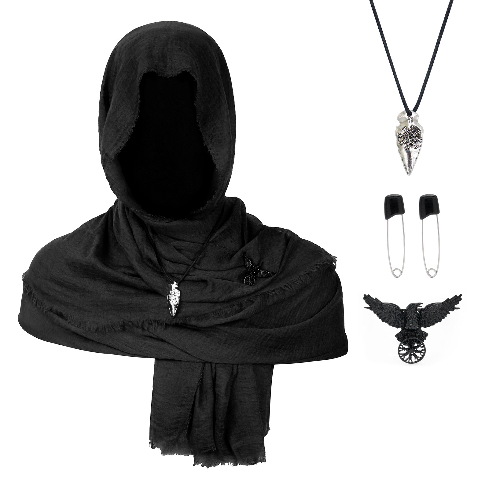 cst154bk (black scarf 180*90cm + one pair of black pins + black raven scarf buckle + snowflake pendant)