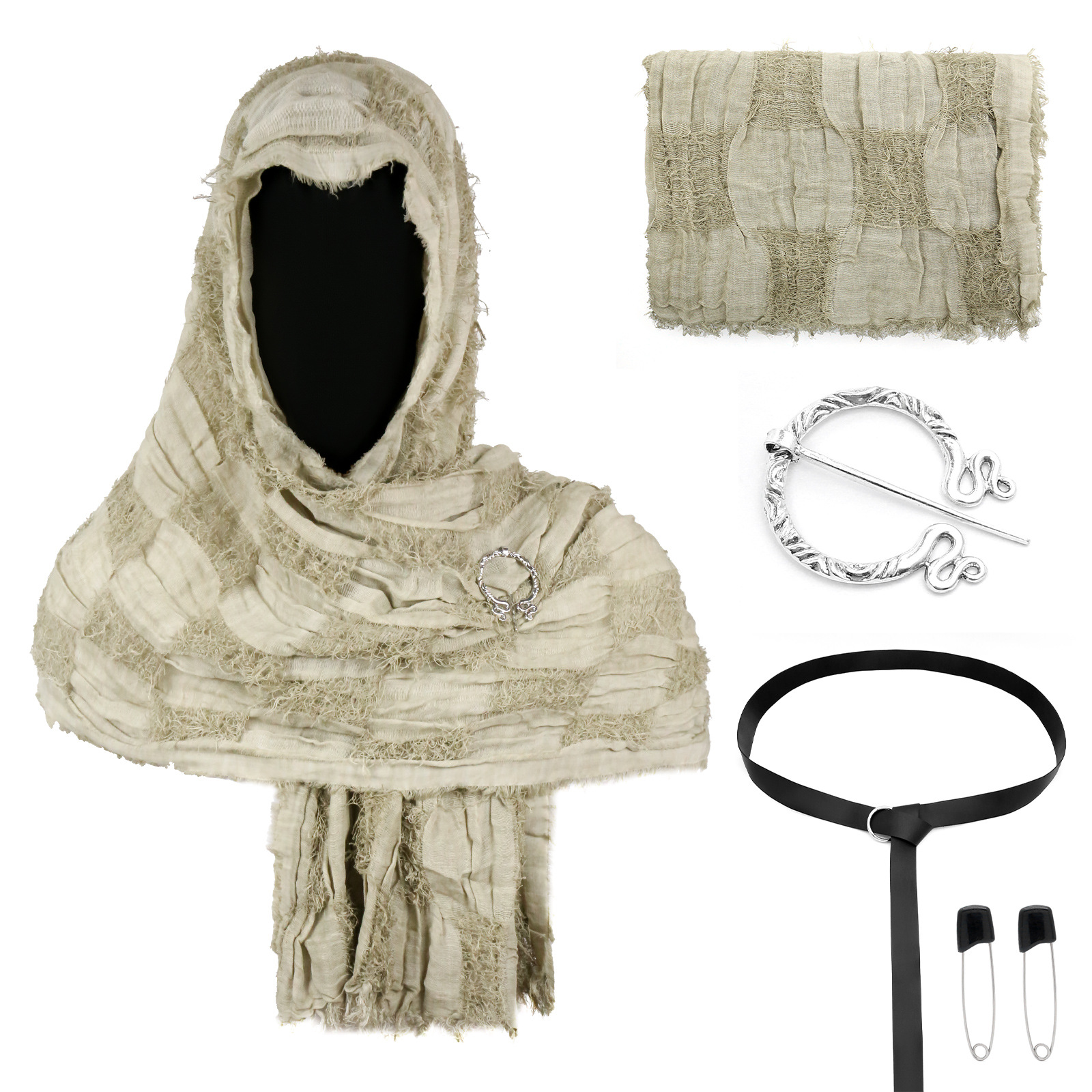 cst152kh khaki distressed scarf (190cm*70cm) + brooch + pin + belt