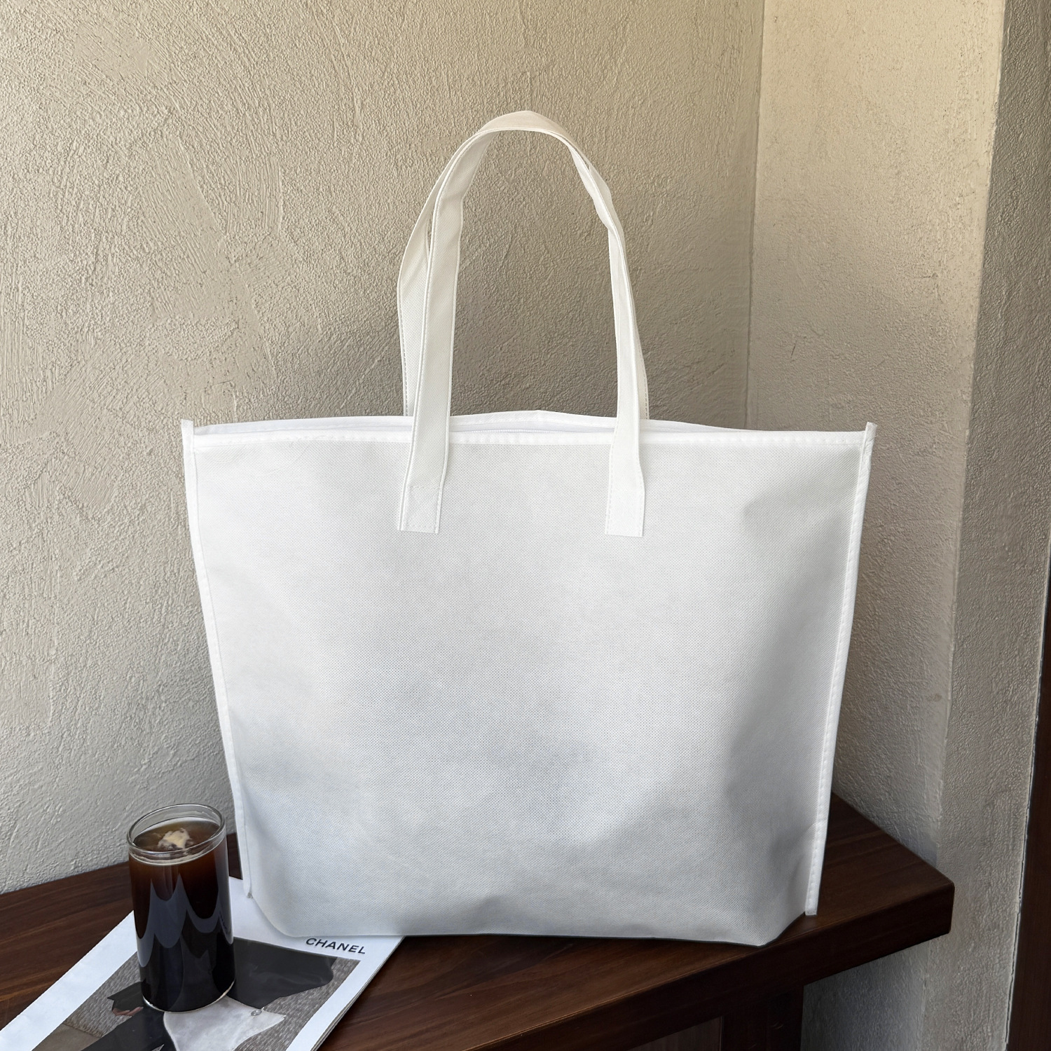 white blank non-woven tote bag with zipper; extra-large size 50 x 38 x 12 cm; 1 piece