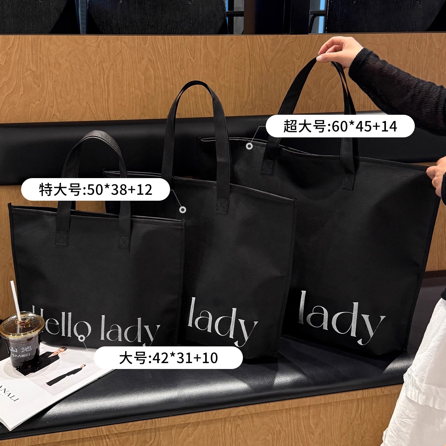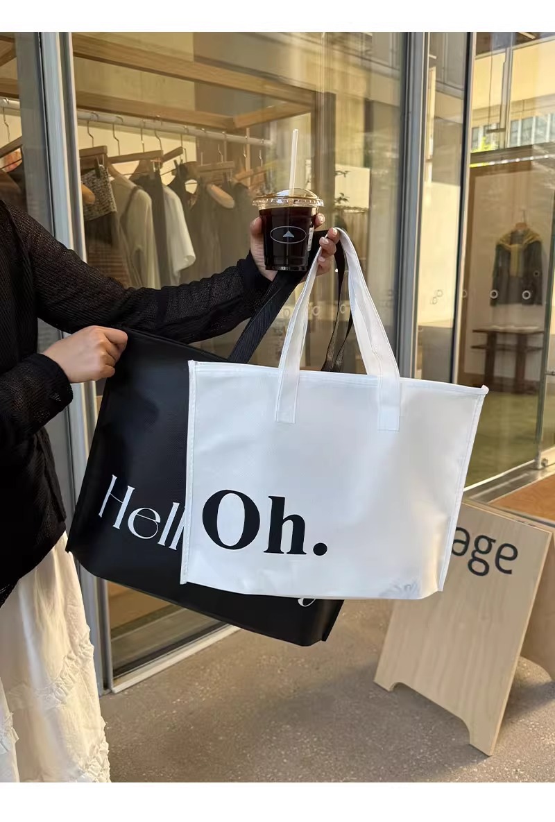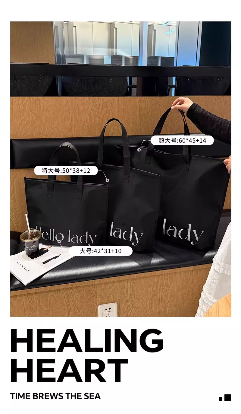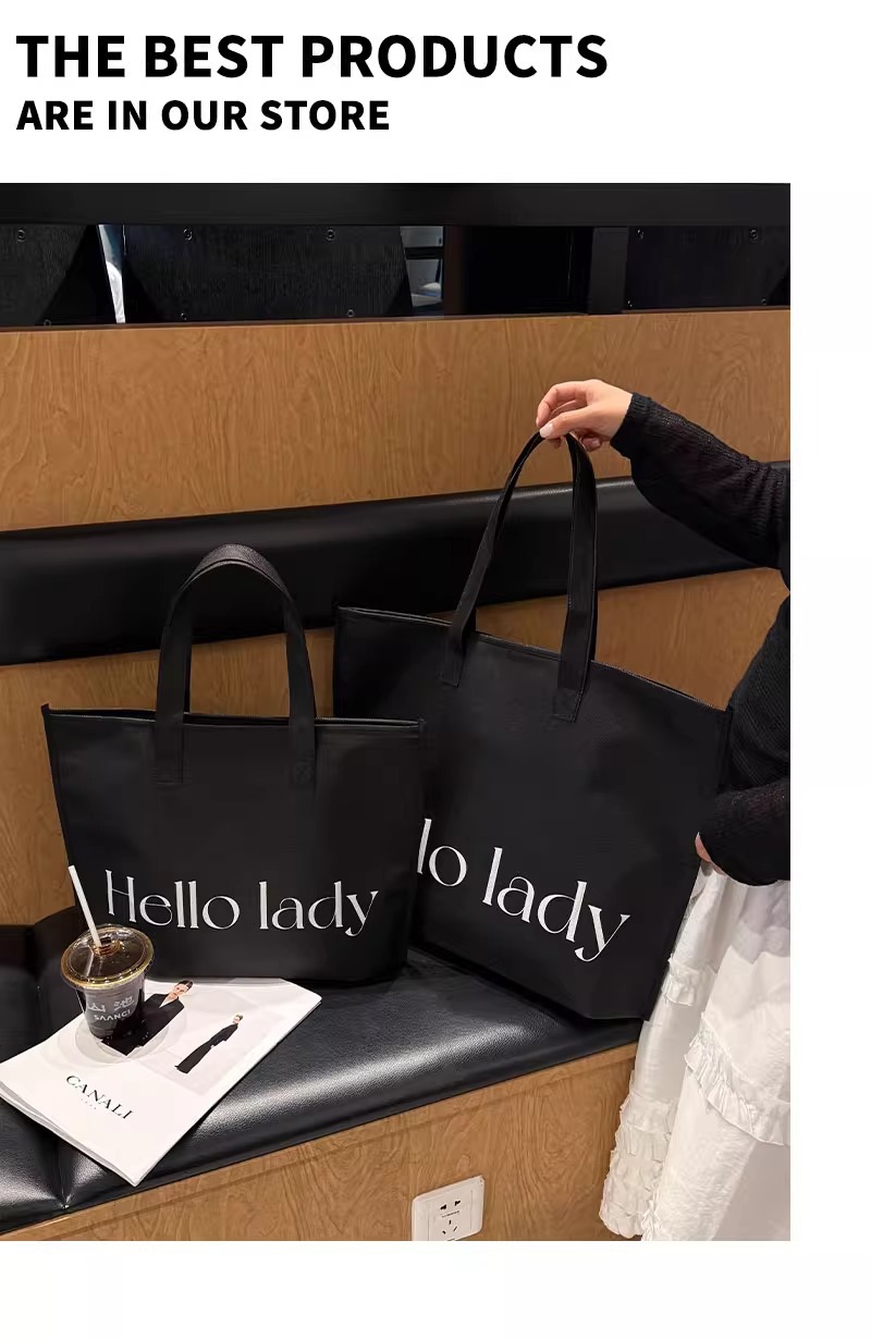 black hello zippered tote bag; extra-large size 60*45*14 cm; 1 piece