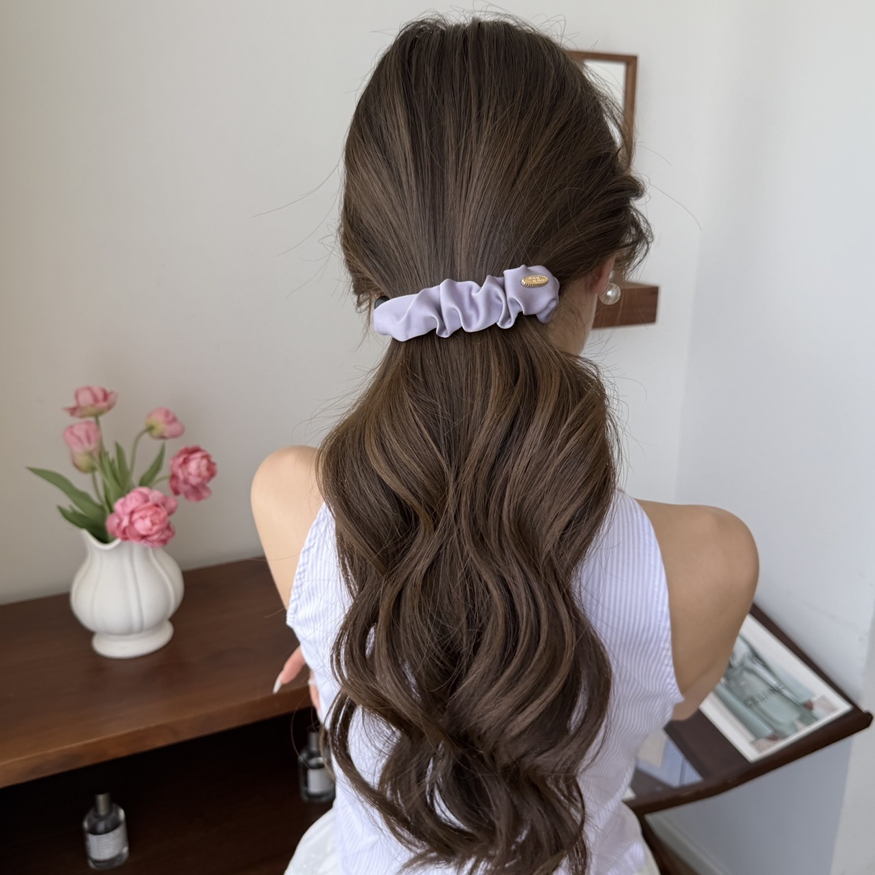 beige small gold label pleated banana clip