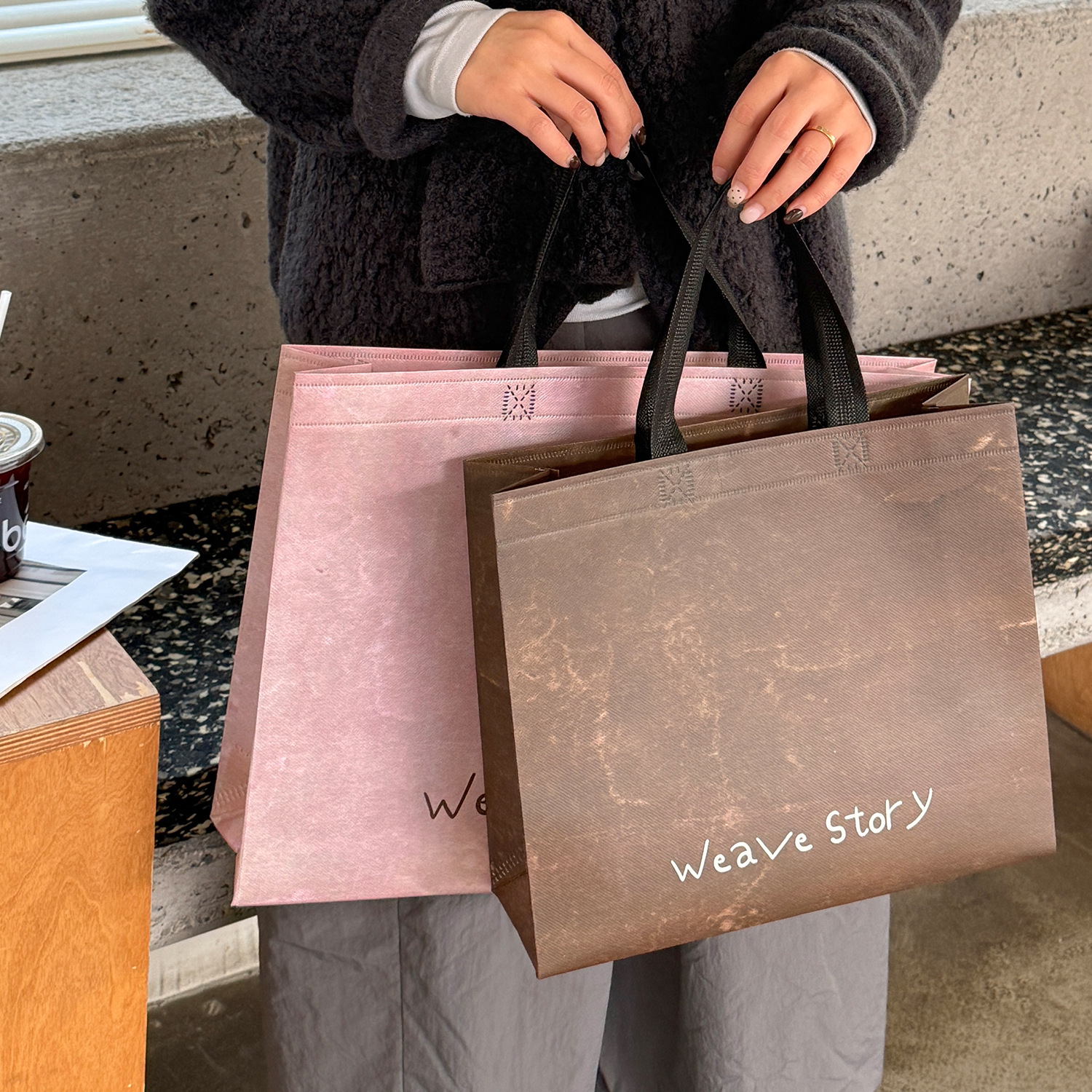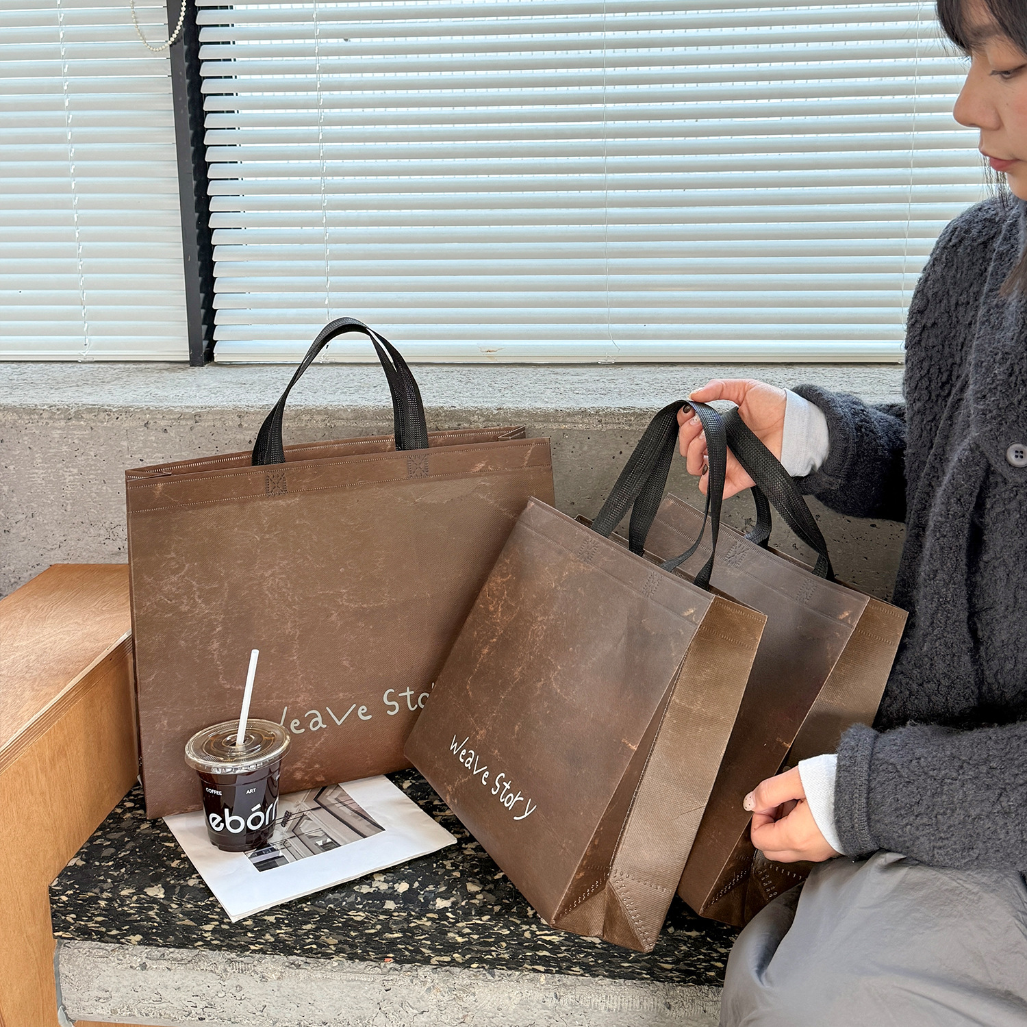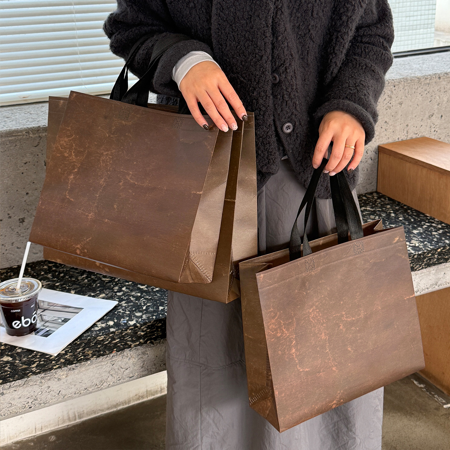 weave vintage brown non-woven tote bag; medium size: 32cm long, 28cm high, 10cm wide; 1 piece