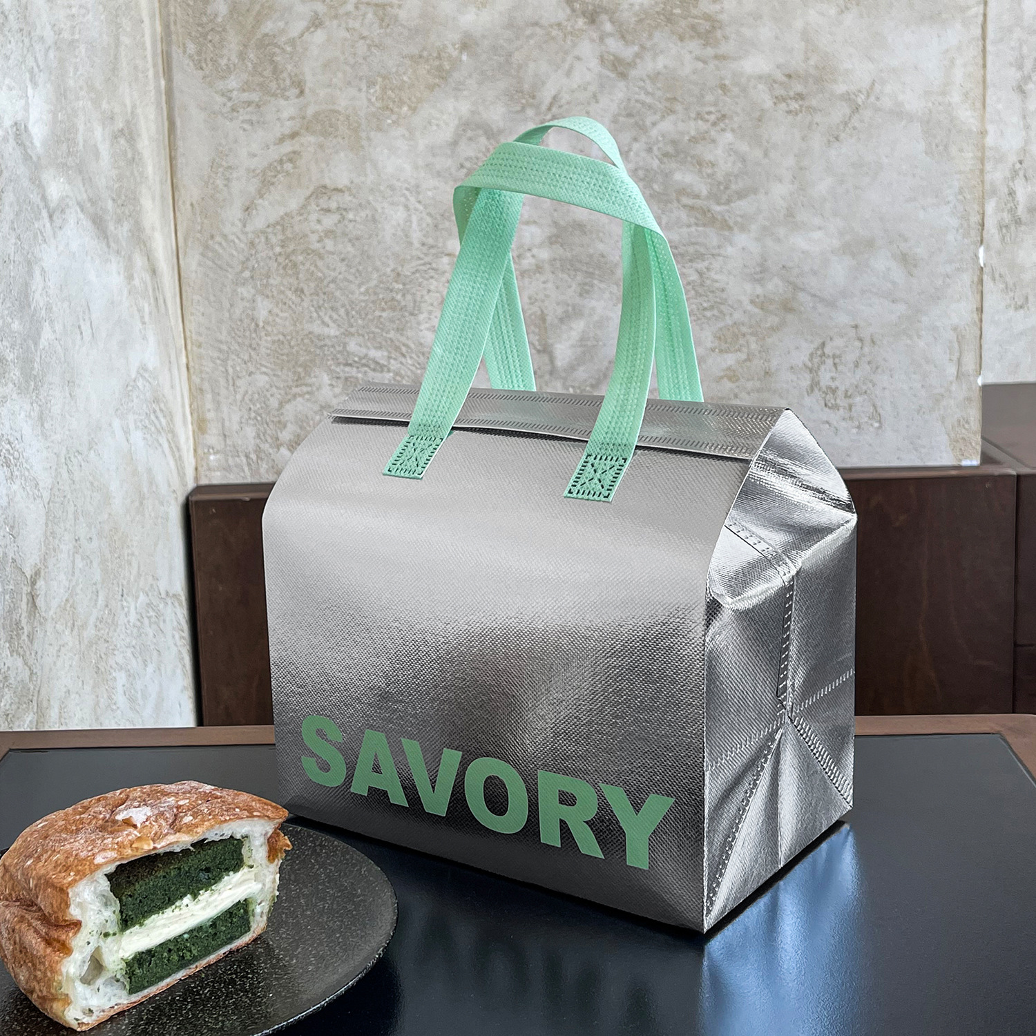 savory green handheld silver polyester glossy film bag; medium size: 24*24*15 cm; 1 piece