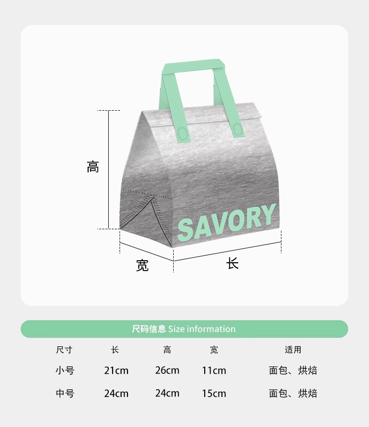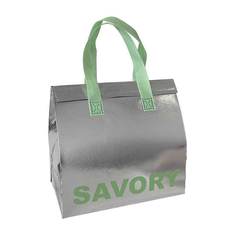 green portable silver polyester glossy film thermal bag; small size: 21*26*11cm; 1 piece