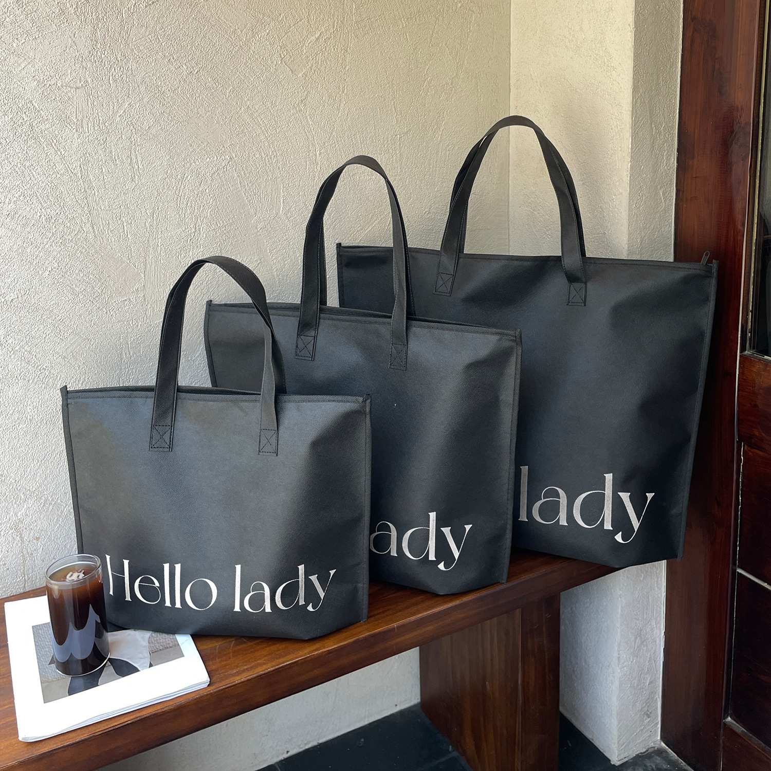 black hello zippered tote bag; large size 42*31*10 cm; 1 piece