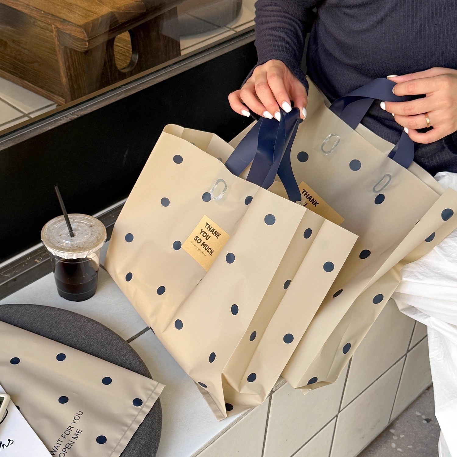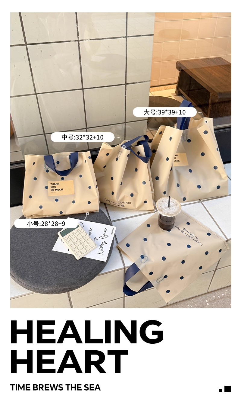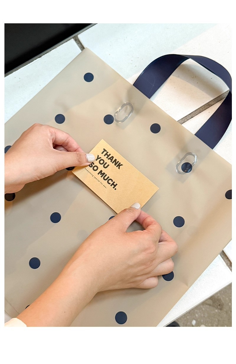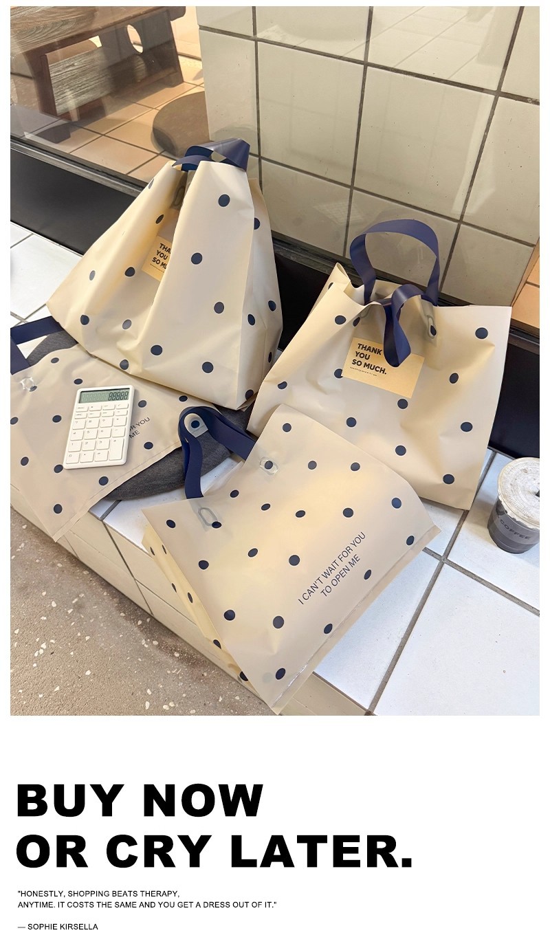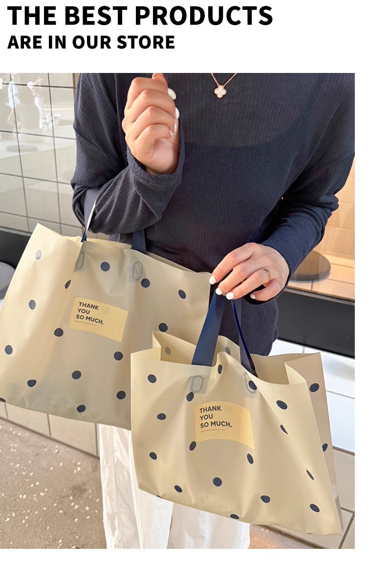 linen-colored matte plastic bags with polka dots; large size, 39 x 39 x 10 cm; 50 pieces