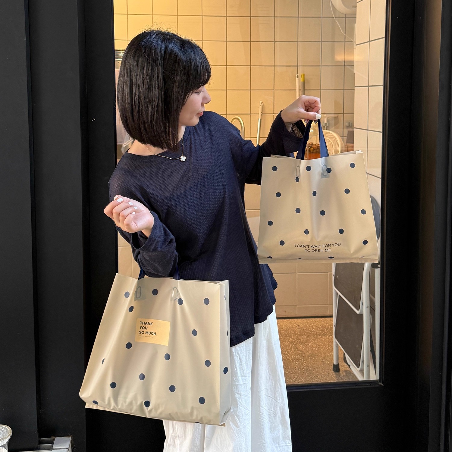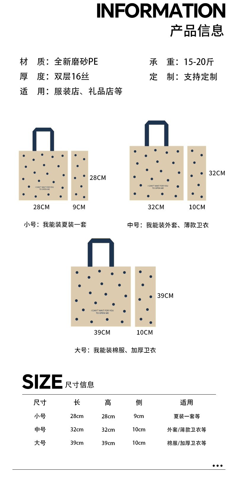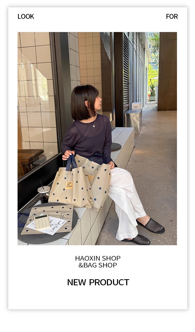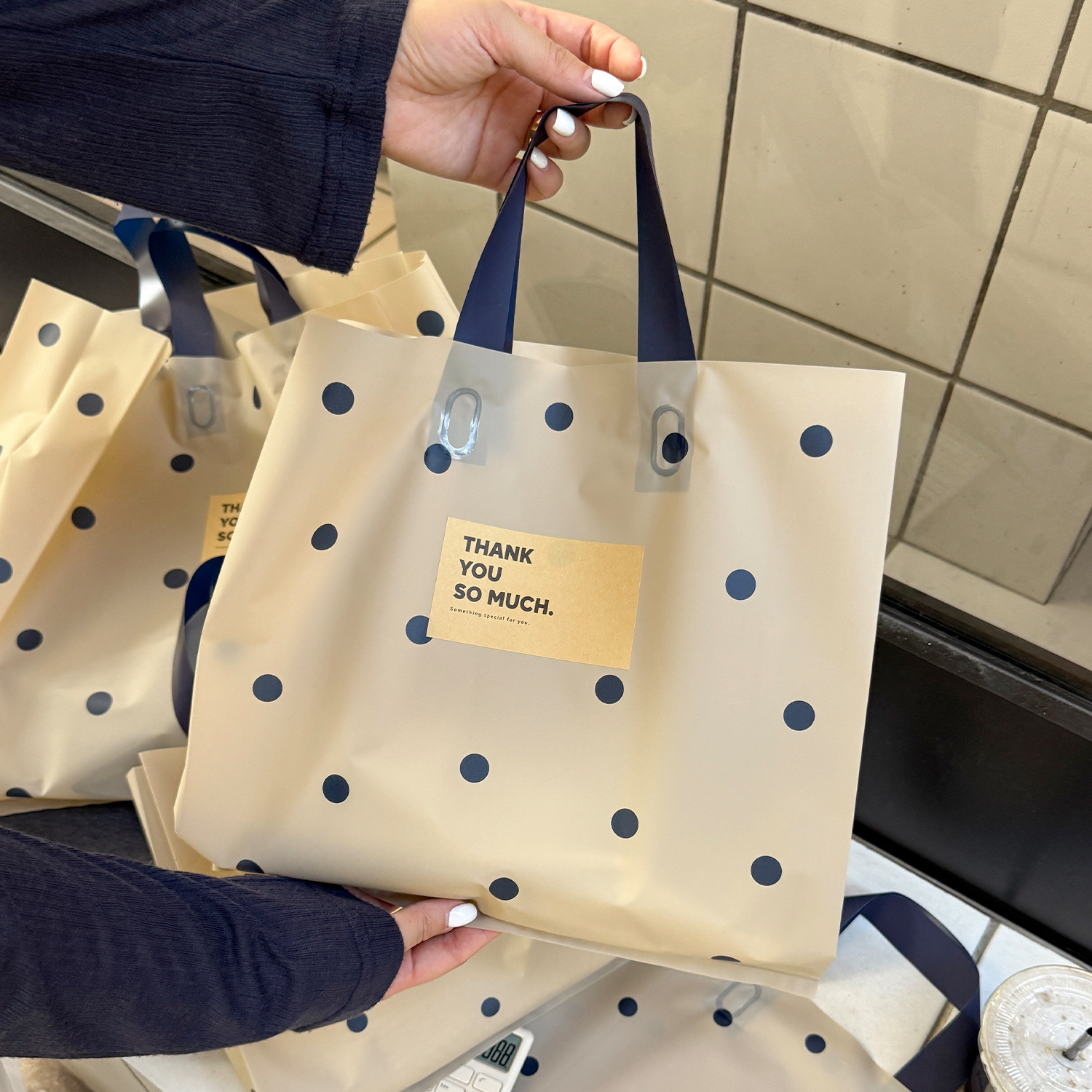 linen-colored matte plastic bags with polka dots; large size, 39 x 39 x 10 cm; 50 pieces