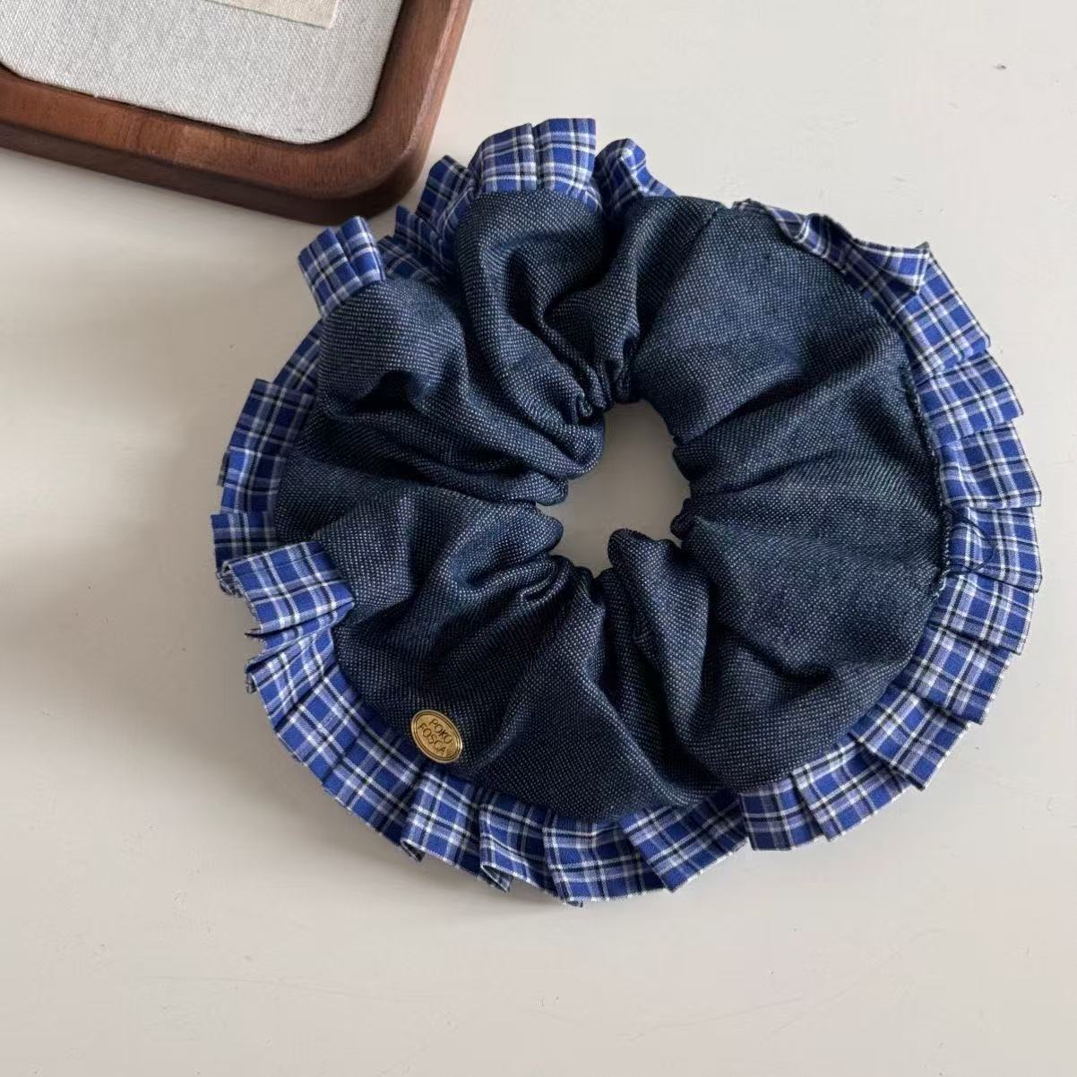 blue denim plaid lace trim label, approximately 13cm large hair tie.