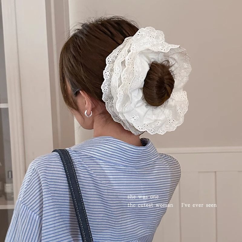 white floral lace trim, double-layered, approximately 14cm large hair tie
