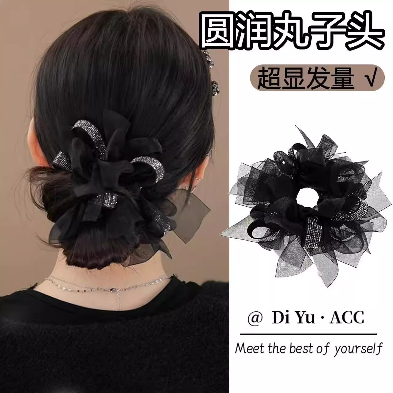 [black] mesh rhinestone bowknot hair ring