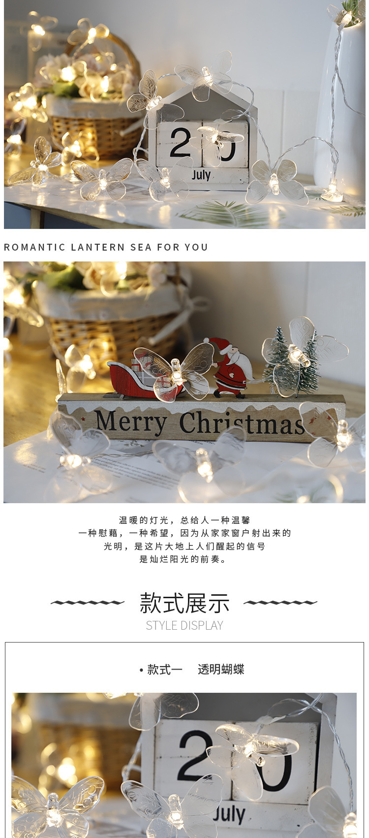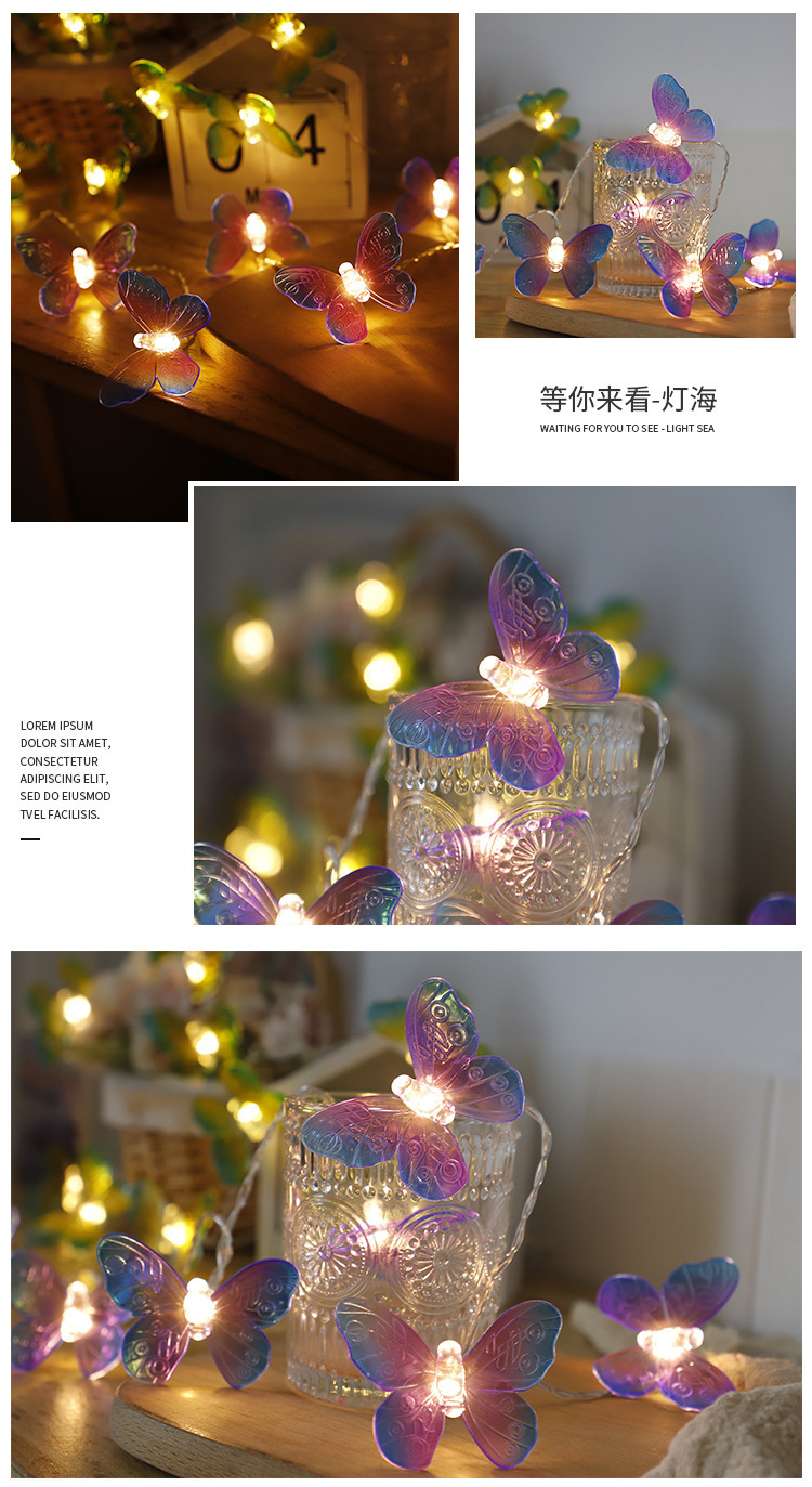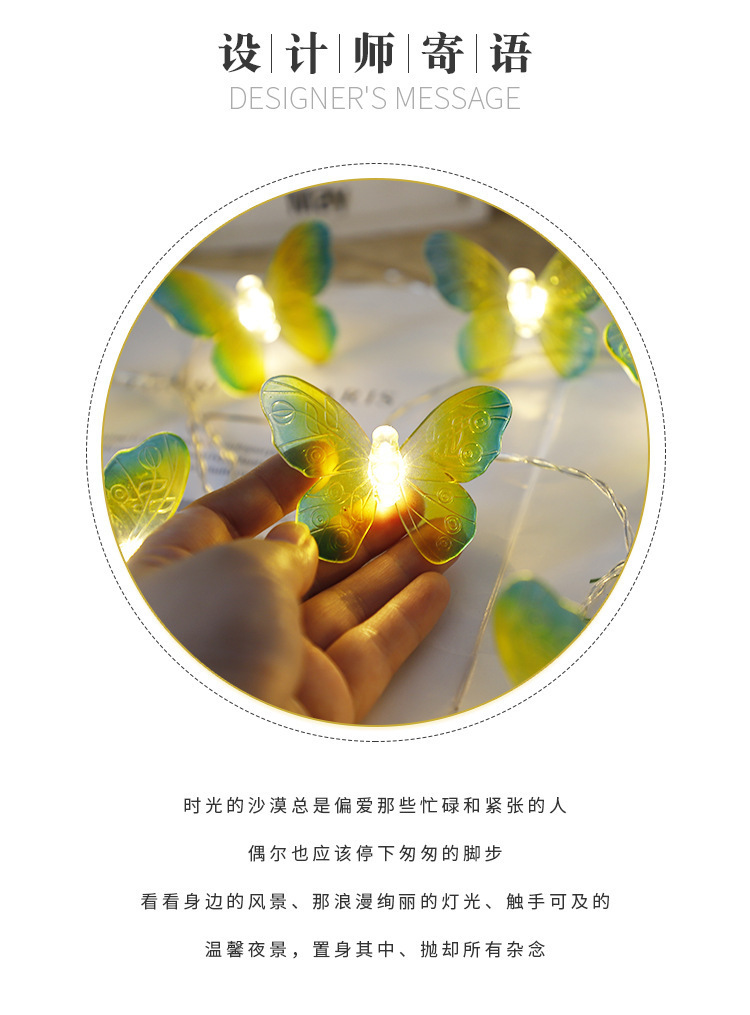 transparent butterfly-shaped string lights, 6 meters long with 40 warm white led bulbs, battery-operated.