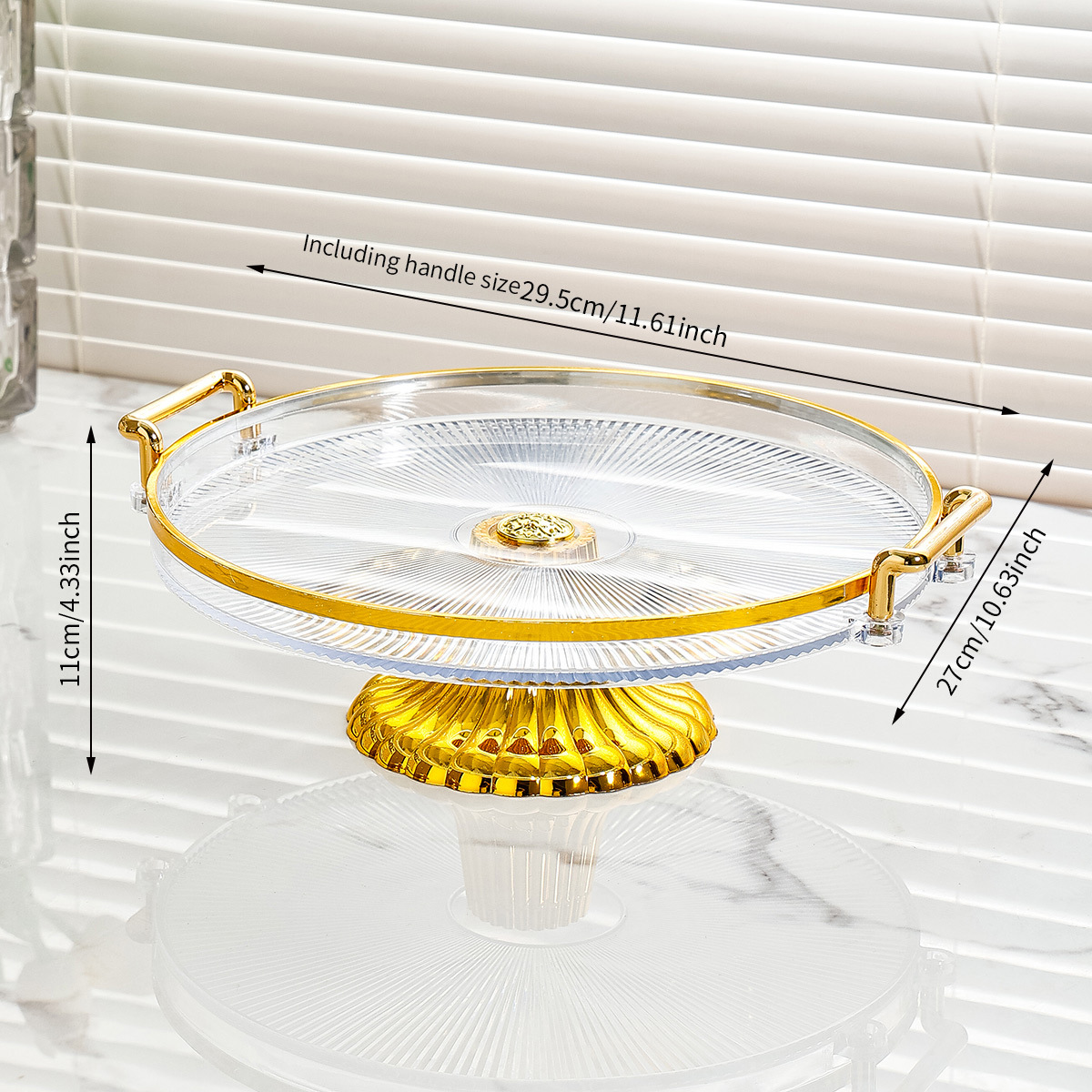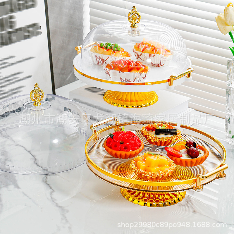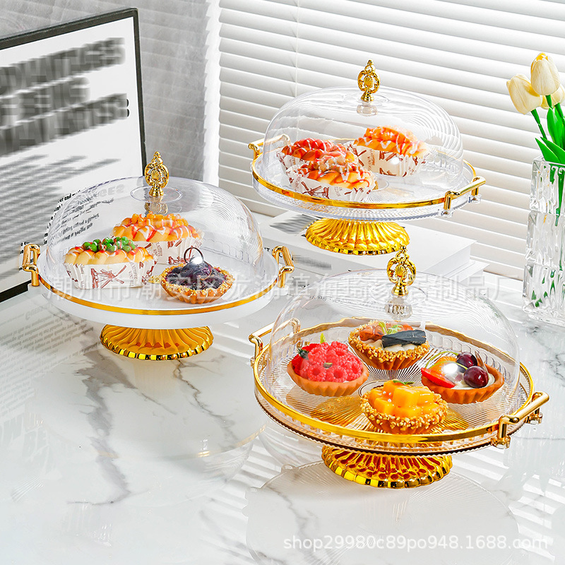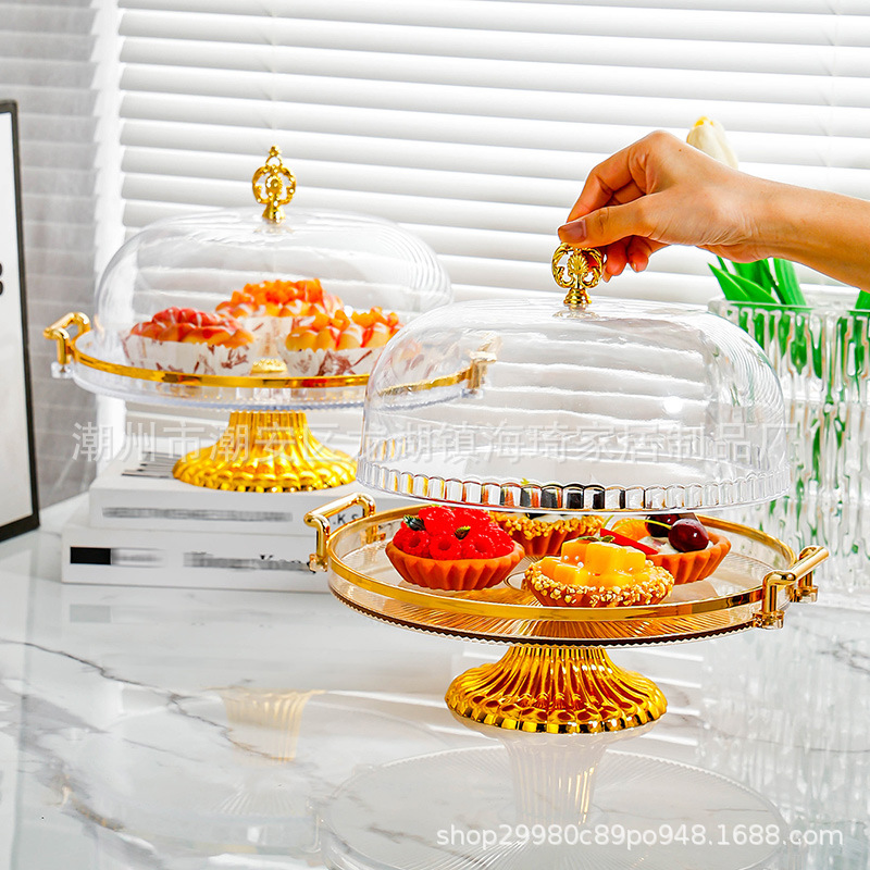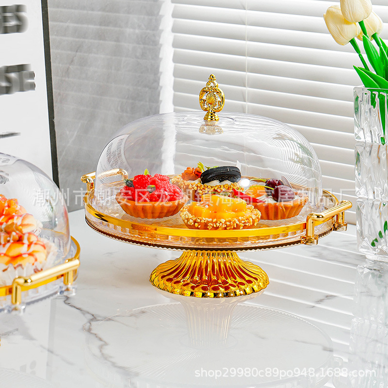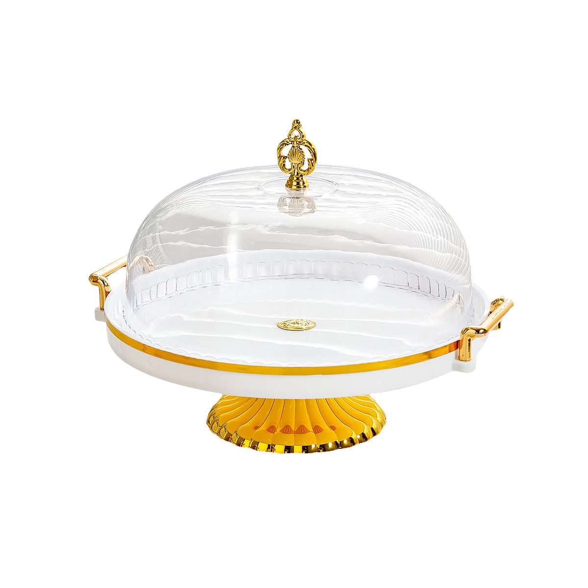 lidded, two-handled striped round platter with feet – clear cake plate