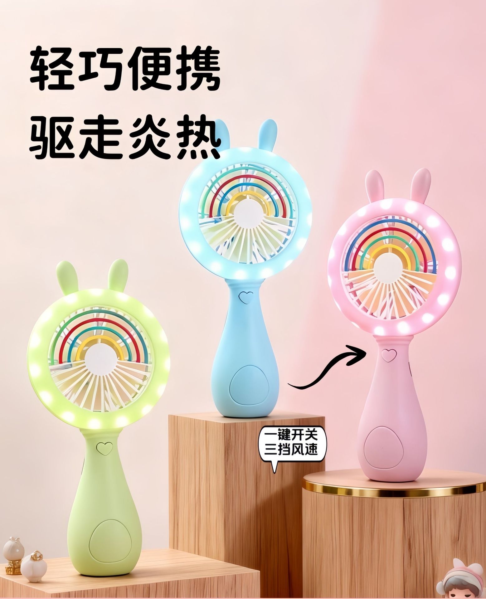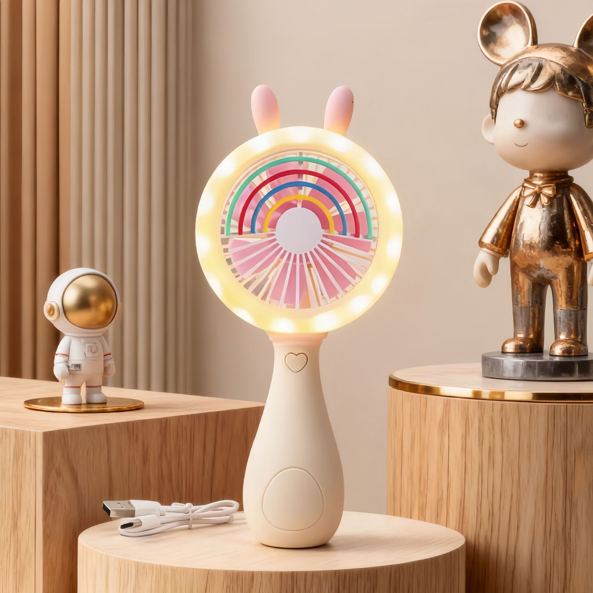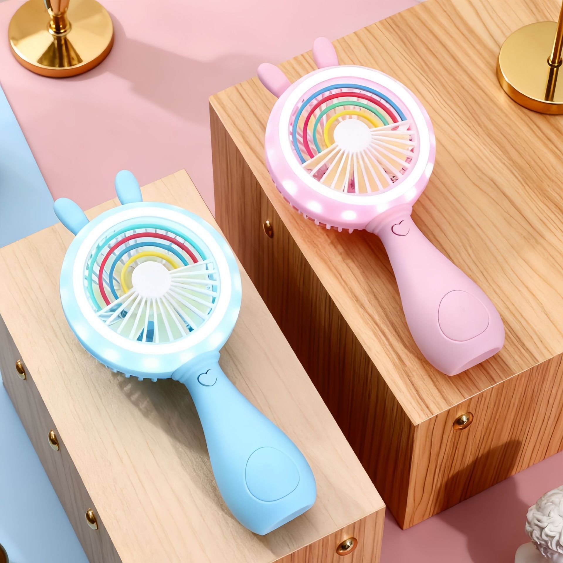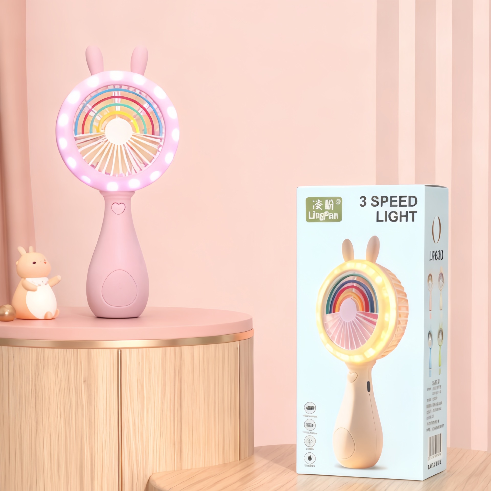 good-looking cartoon rainbow rabbit ears handheld fan three-gear wind charging with light children mini fan