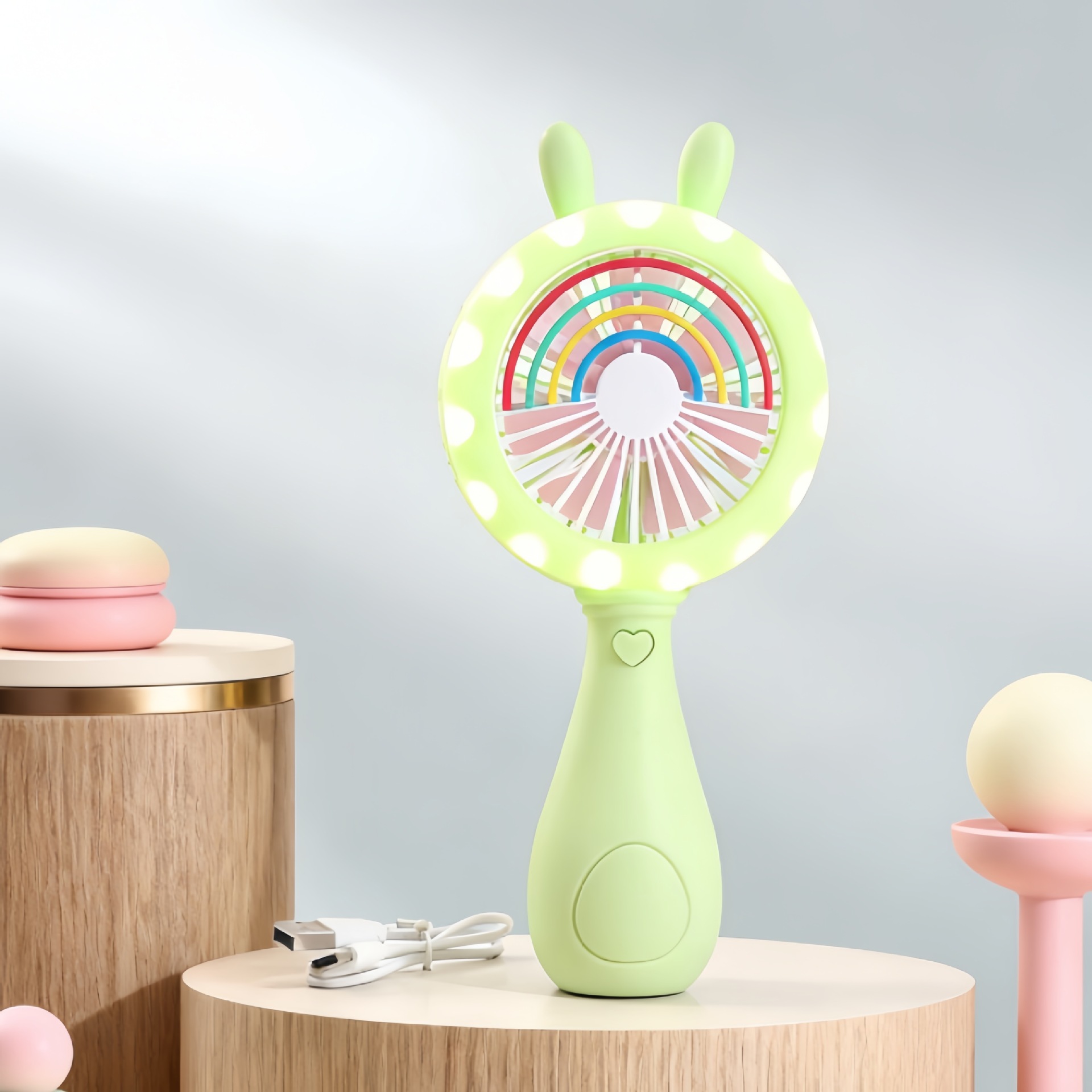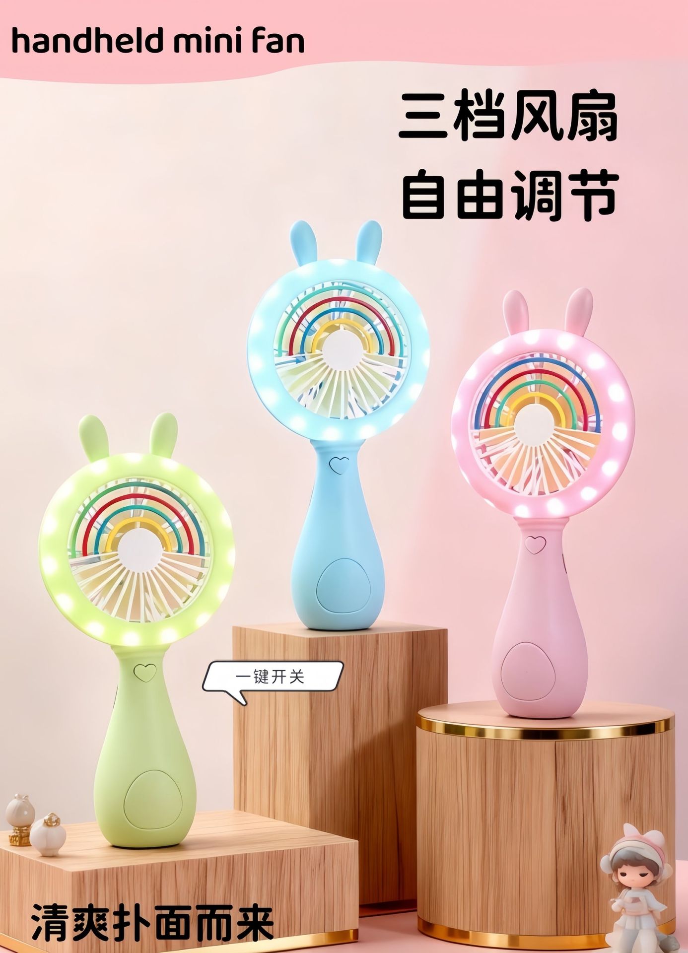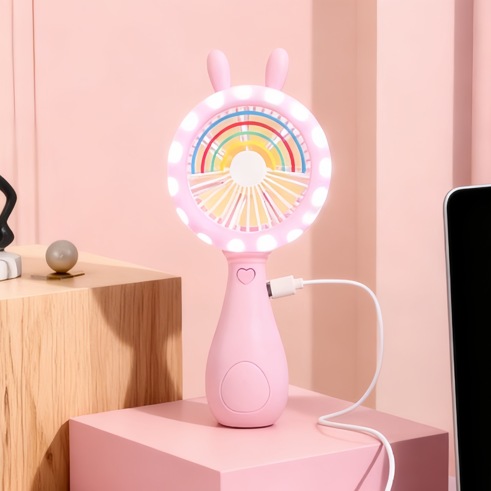 good-looking cartoon rainbow rabbit ears handheld fan three-gear wind charging with light children mini fan