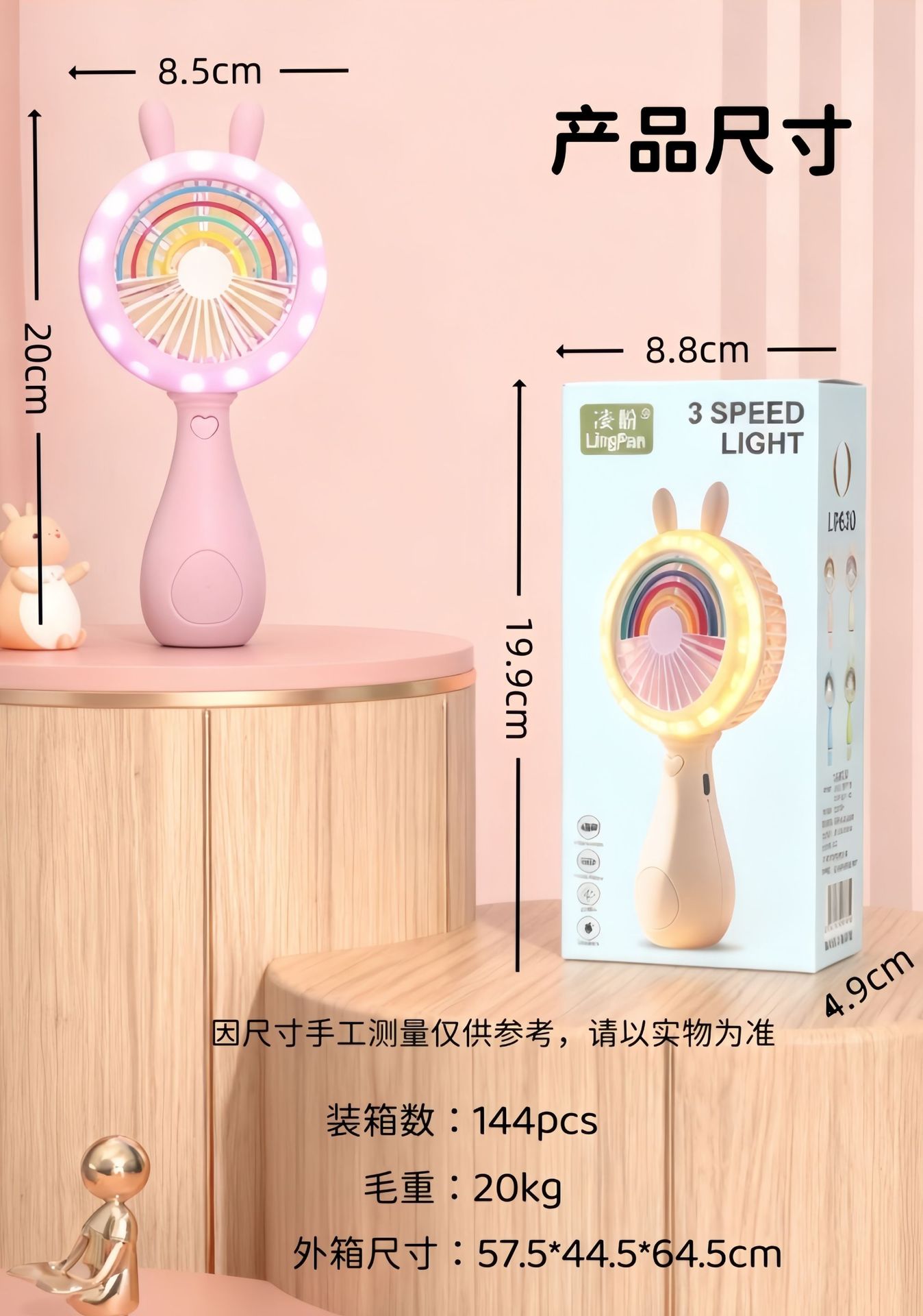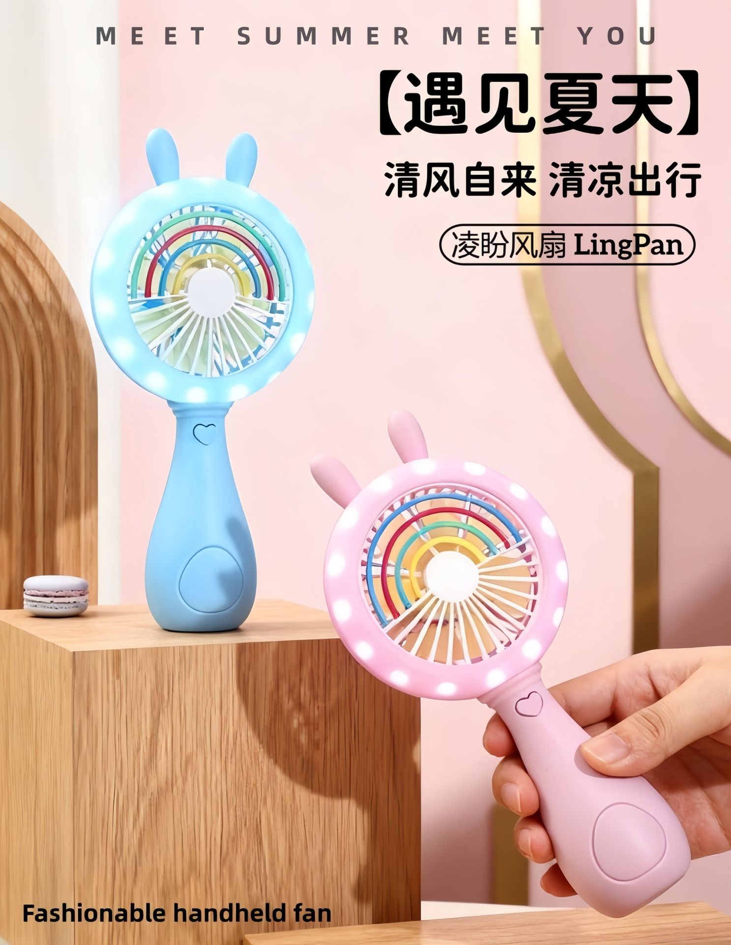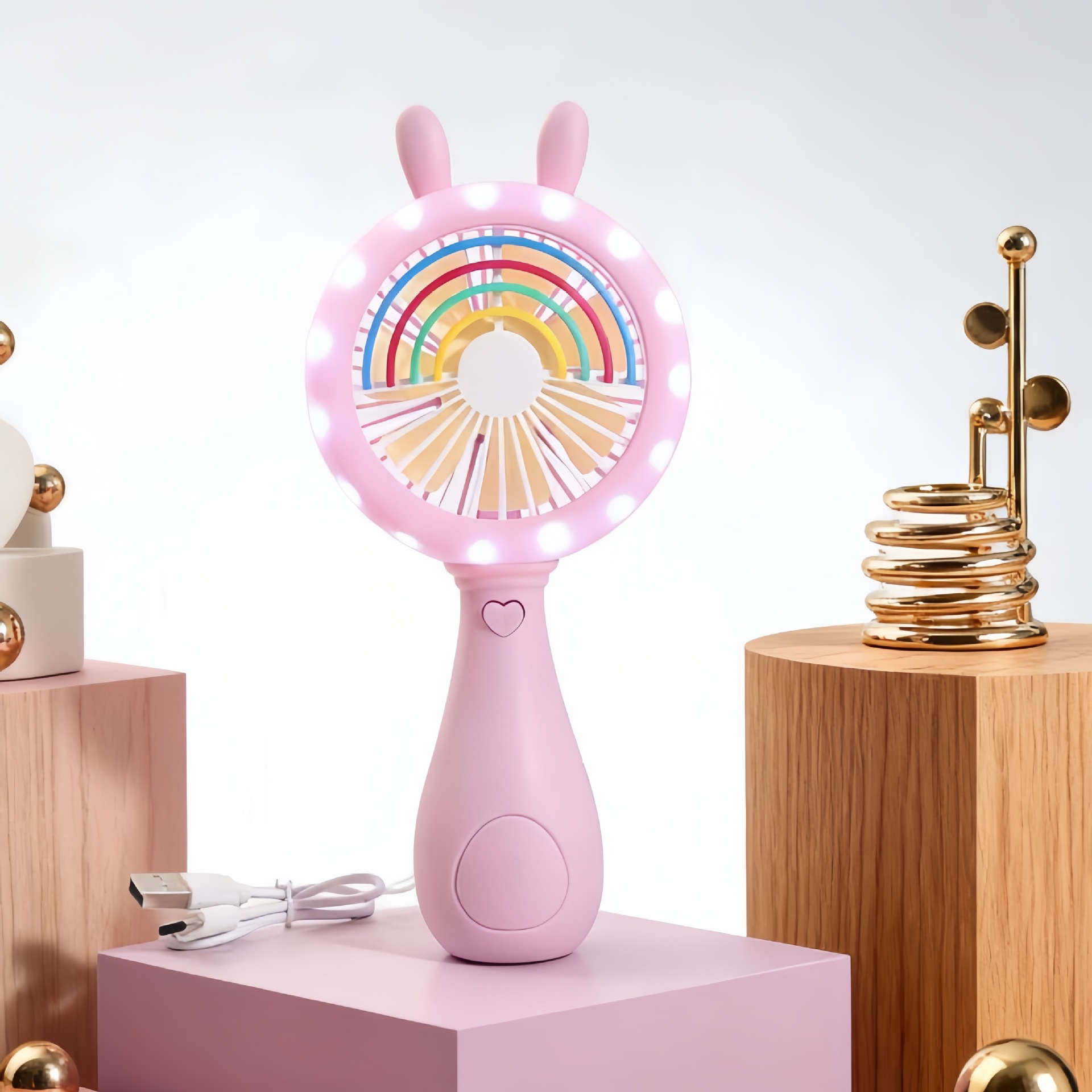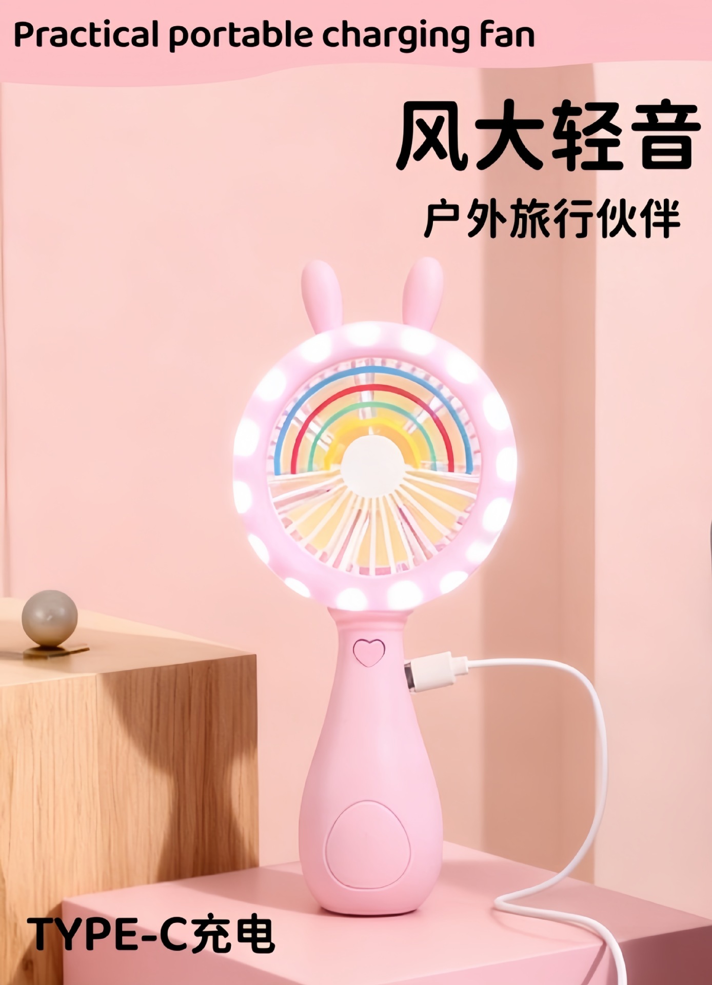 good-looking cartoon rainbow rabbit ears handheld fan three-gear wind charging with light children mini fan