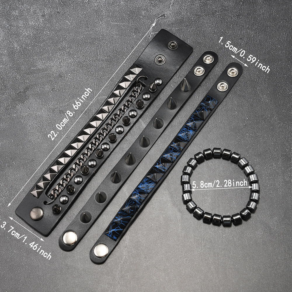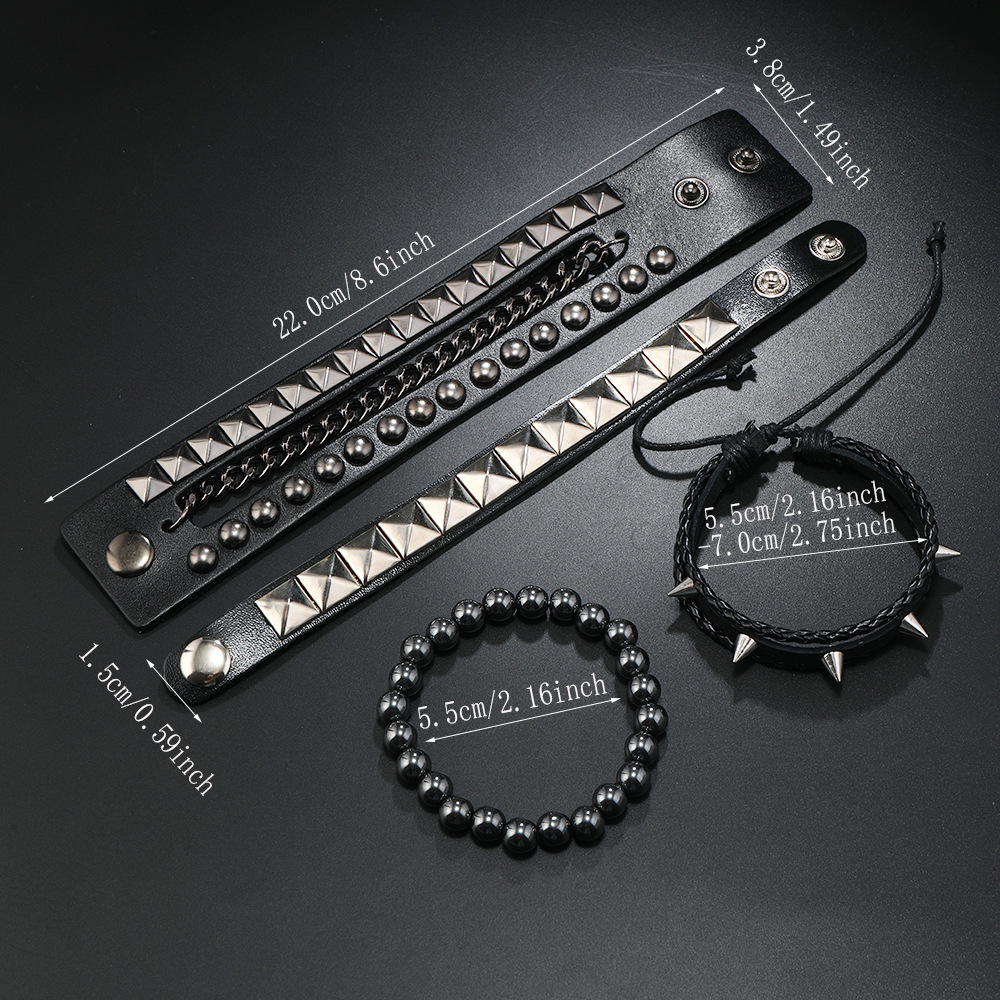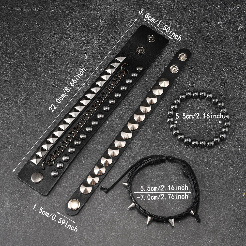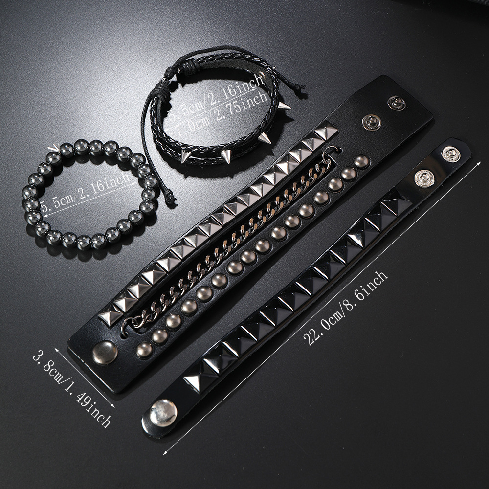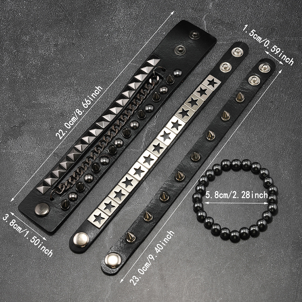 Size: Chain Bracelet is 22cm long and 3.8cm wide, Studded Bracelet is 22cm long and 1.5cm wide, Beaded Bracelet is 5.5cm in diameter, and the beads are 8mm in size. Studded Bracelet is 5.5-7.0cm long (adjustable).