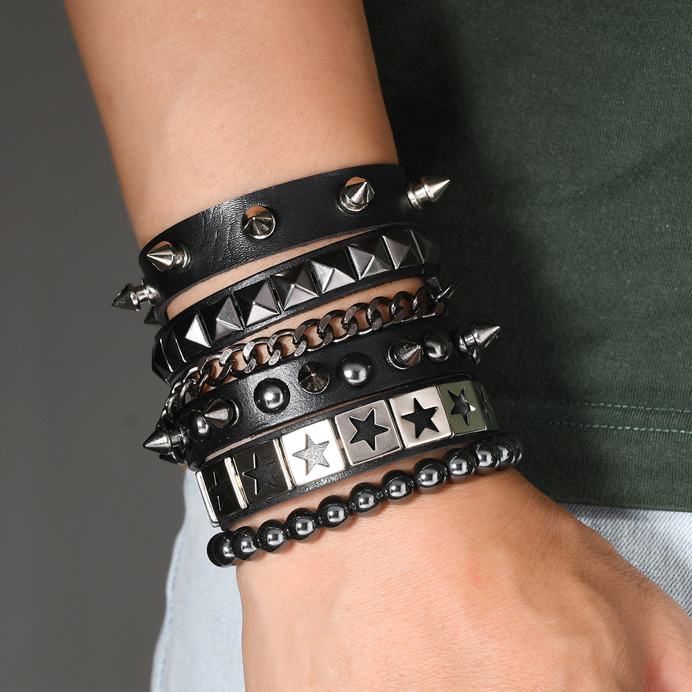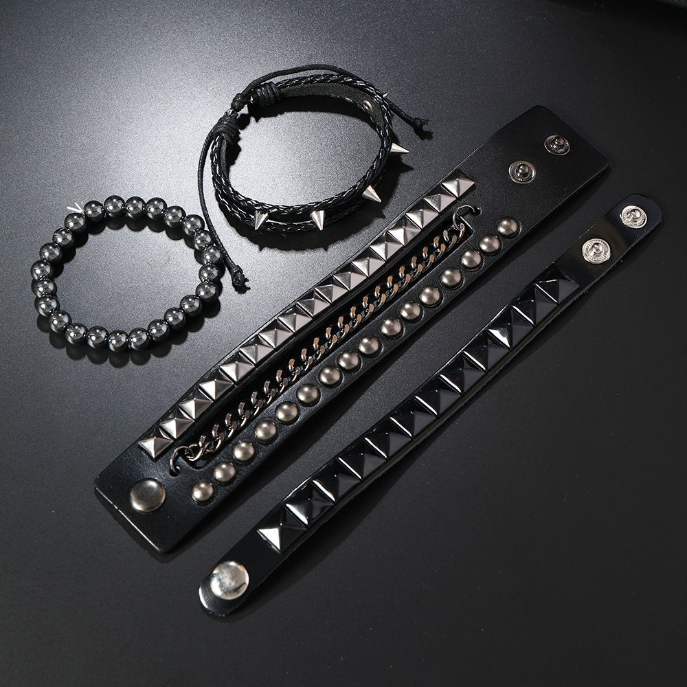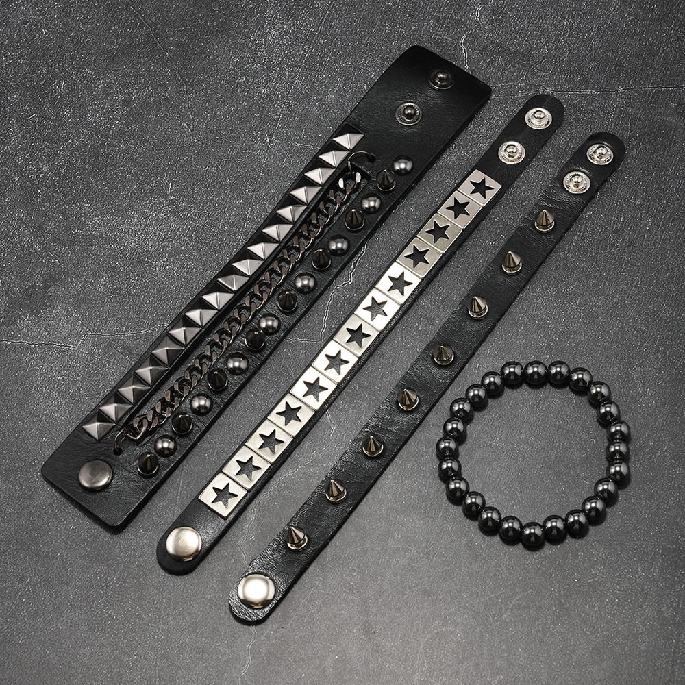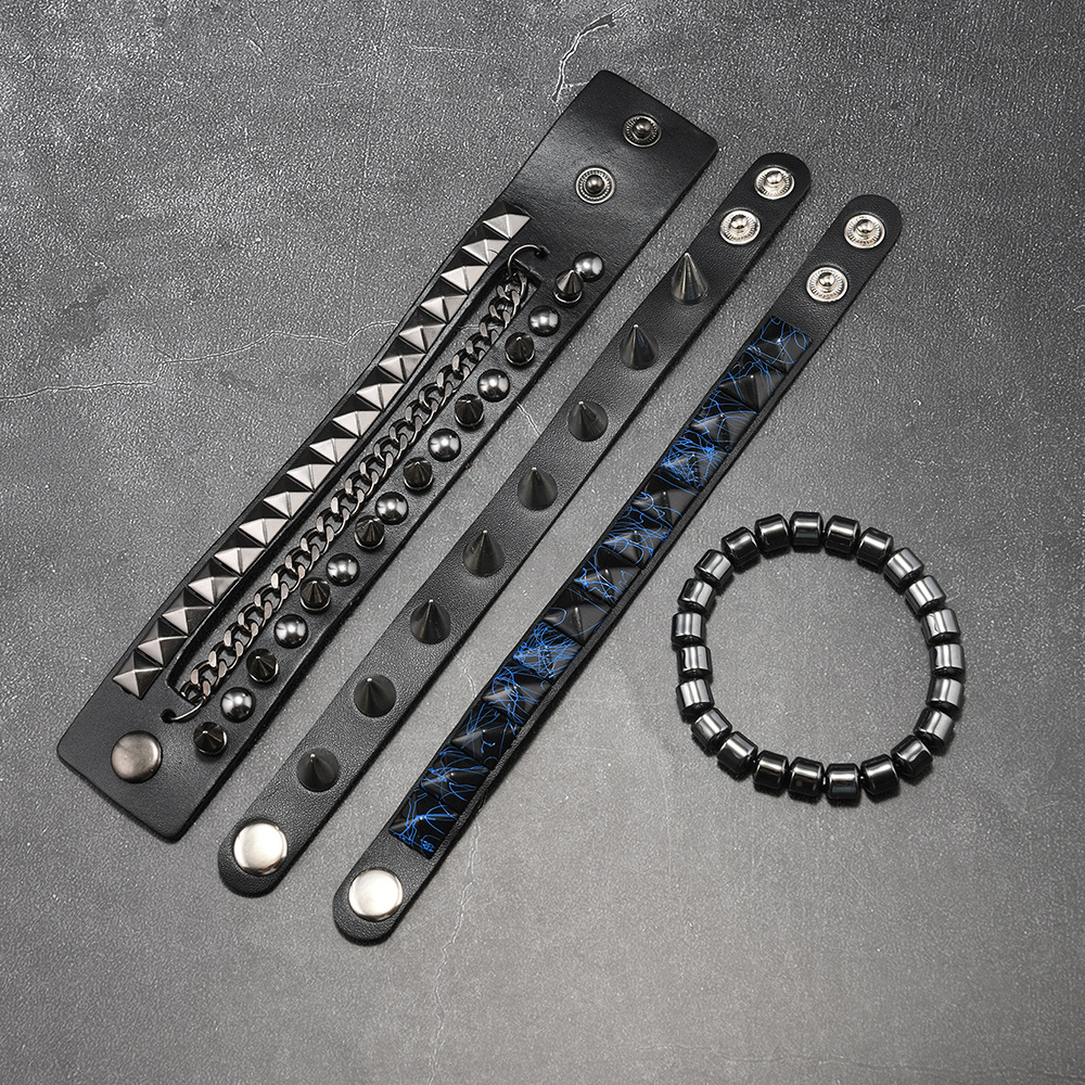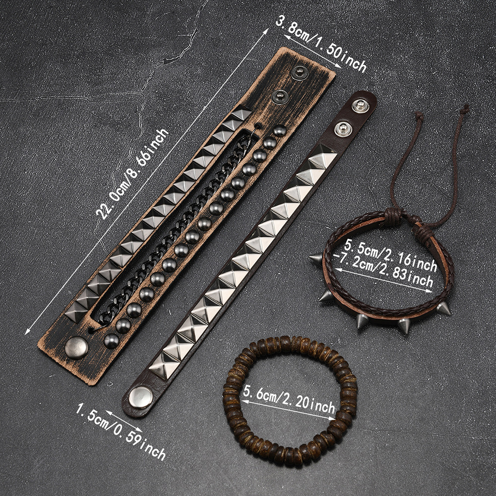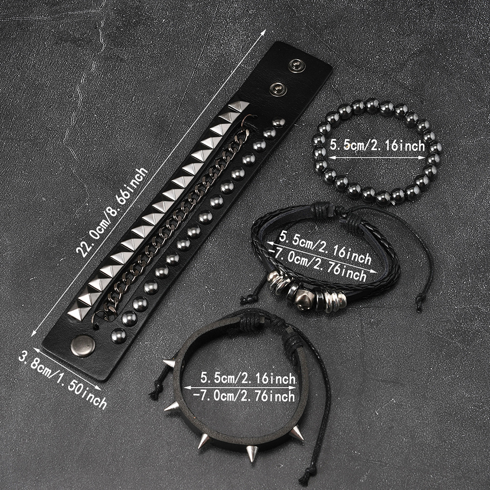 Size: Chain Bracelet is 22cm long and 3.8cm wide, Studded Bracelet is 22cm long and 1.5cm wide, Beaded Bracelet is 5.5cm in diameter, and the beads are 8mm in size. Studded Bracelet is 5.5-7.0cm long (adjustable).
