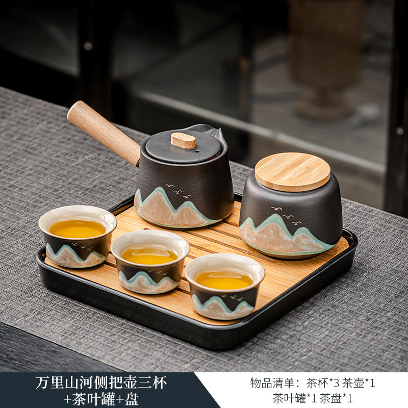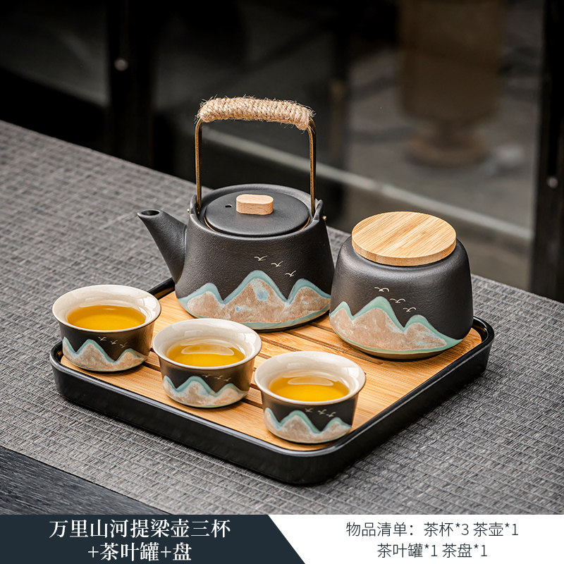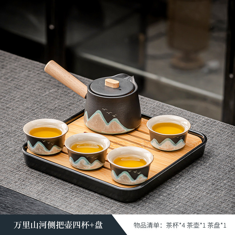 wanli mountain river side handle pot three cups + tea pot + plate.