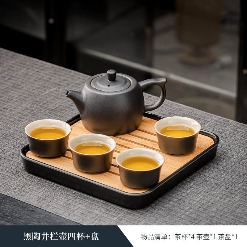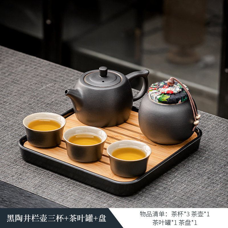 black porcelain manhole pot three cups + tea pot + plate